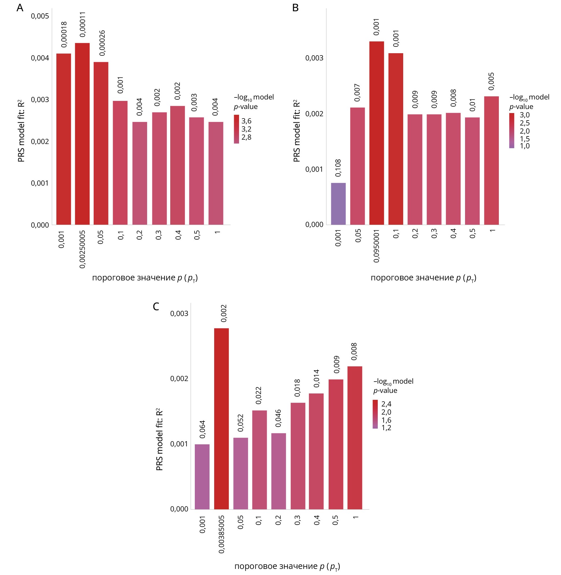 Рисунок 2. Индексы полигенного риска депрессии, биполярного аффективного расстройства и шизофрении статистически значимо связаны с фенотипом ангедонии на протяжении жизни. Примечание: На оси X показано пороговое значение p, используемое для выбора SNP на основании данных GWAS: (A) метаанализ депрессии на основании данных PGC и UK Biobank; (B) биполярного расстройства на основании данных PGC; (C) шизофрении PGC (исследования 2-й волны). На оси Y показана процентная дисперсия по шкале предрасположенности. Значения p ассоциации между индексами полигенного риска и фенотипом ангедонии на протяжении жизни указаны над каждым столбцом.