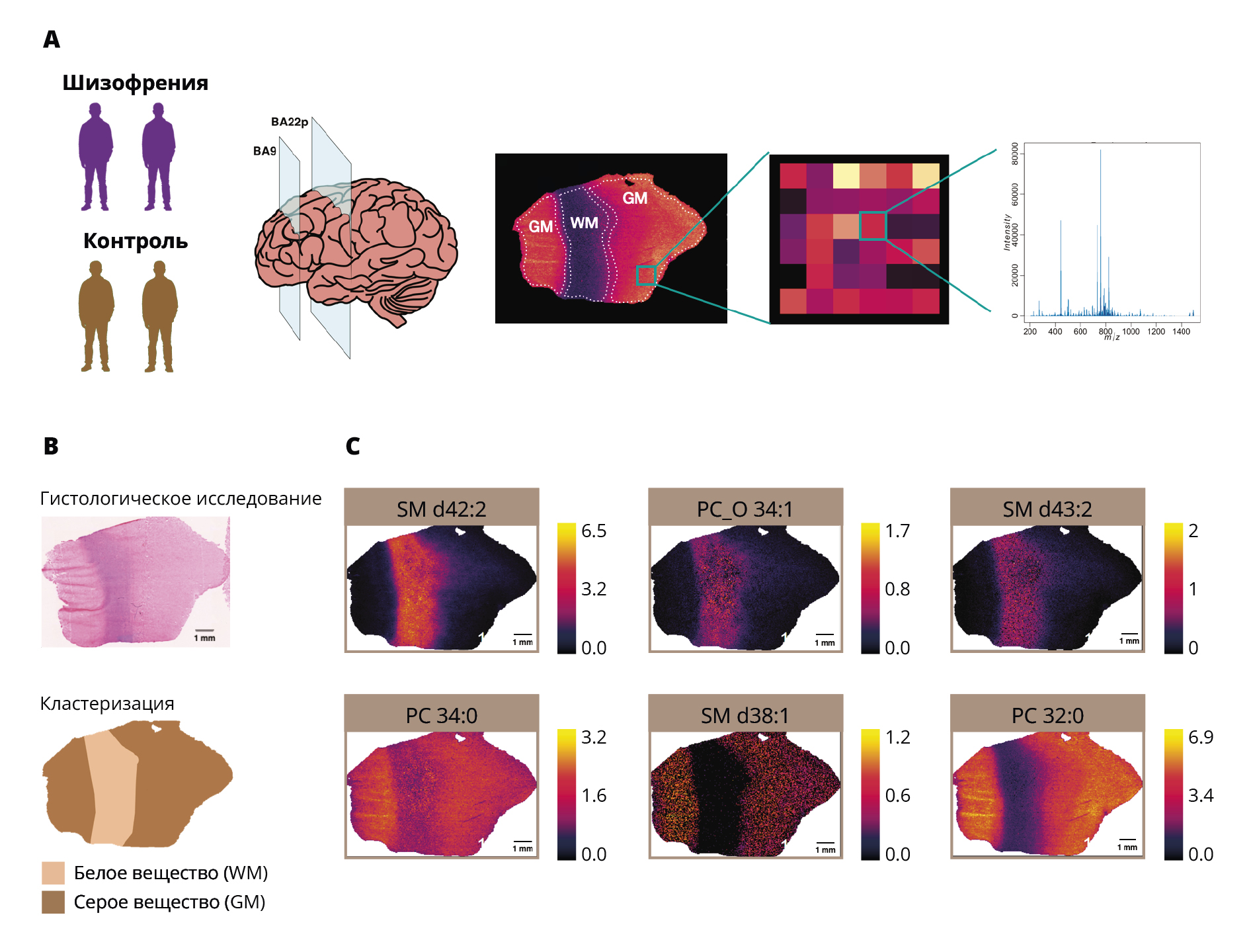 Примечание: (A) Схематическое представление анализа образцов. Слева направо: выборка для получения образцов, выполнение тонких срезов двух областей головного мозга (поля BA9 и BA22p) и пространственное распределение уровней интенсивности отдельных масс-спектрометрических пиков, отвечающих за специфический молекулярный ион, определяемый на масс-спектрограмме, которую получают для каждого пикселя среза ткани. (В) Гистологическое окрашивание и кластеризация сигналов MALDI-MSI для пикселей одного из 24 исследованных срезов неокортекса. (С) Примеры липидов, демонстрирующих очевидные различия в распределении интенсивности между зонами серого и белого вещества неокортикальной области.