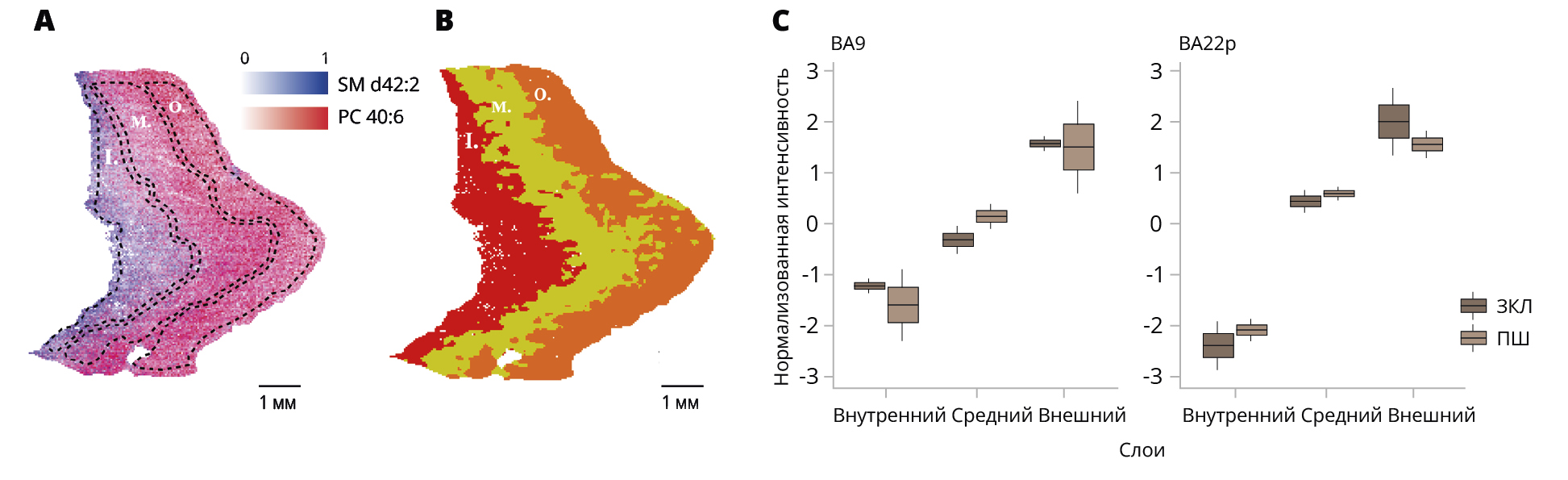 В исследовании первичной зрительной коры [19] были описаны различия липидного профиля между слоями в двух соседних областях, в основном соответствующие известной вариабельности архитектоники кортикального слоя. Визуализация пространственного распределения двух гистологически ассоциированных липидов из вышеупомянутой статьи (SM d42:2, PC 40:6) в кортикальных срезах из настоящего исследования действительно выявила специфические градиенты интенсивности (рис. 2А). Проведение неконтролируемой кластеризации данных образцов серого вещества позволило сегментировать кору головного мозга на три слоя (рис. 2B). Однофакторный дисперсионный анализ выявил значимое различие средних значений содержания липида PC 40:6 в полученных слоях в группе ЗКЛ в обеих зонах BA9 (значение p=0,004) и BA22 (значение p=0,02), а также в группе ПШ в зоне BA22 (значение p=0,002), но не в зоне BA9 (значение p=0,1). Количество наблюдений в каждом сравнении — 4 на группу.