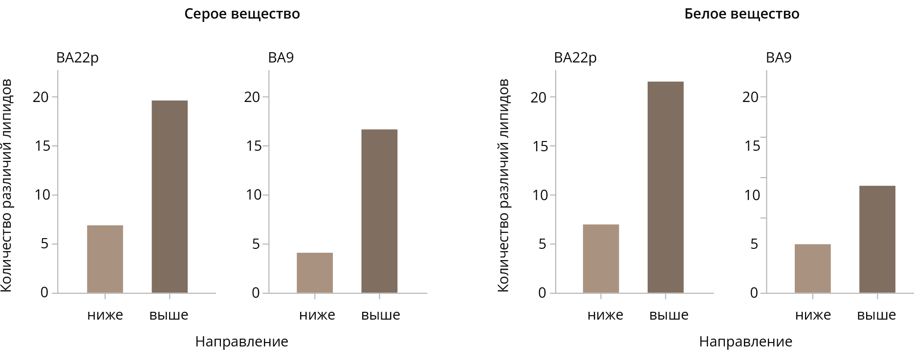 РЕЗУЛЬТАТЫ: Обнаружено неоднородное распределение разницы в уровне липидов, связанных с шизофренией, в двух исследованных областях неокортекса. Белое вещество из BA22p показало больше различий по сравнению с белым веществом из BA9, в то время как в сером веществе дисбаланс количества различий менее выражен. Хотя изменения липидов, связанные с шизофренией, в целом, хорошо согласуются между областями мозга на уровне классов липидов как для серого, так и для белого вещества, было обнаружено значительно больше расхождений для структур белого вещества.
