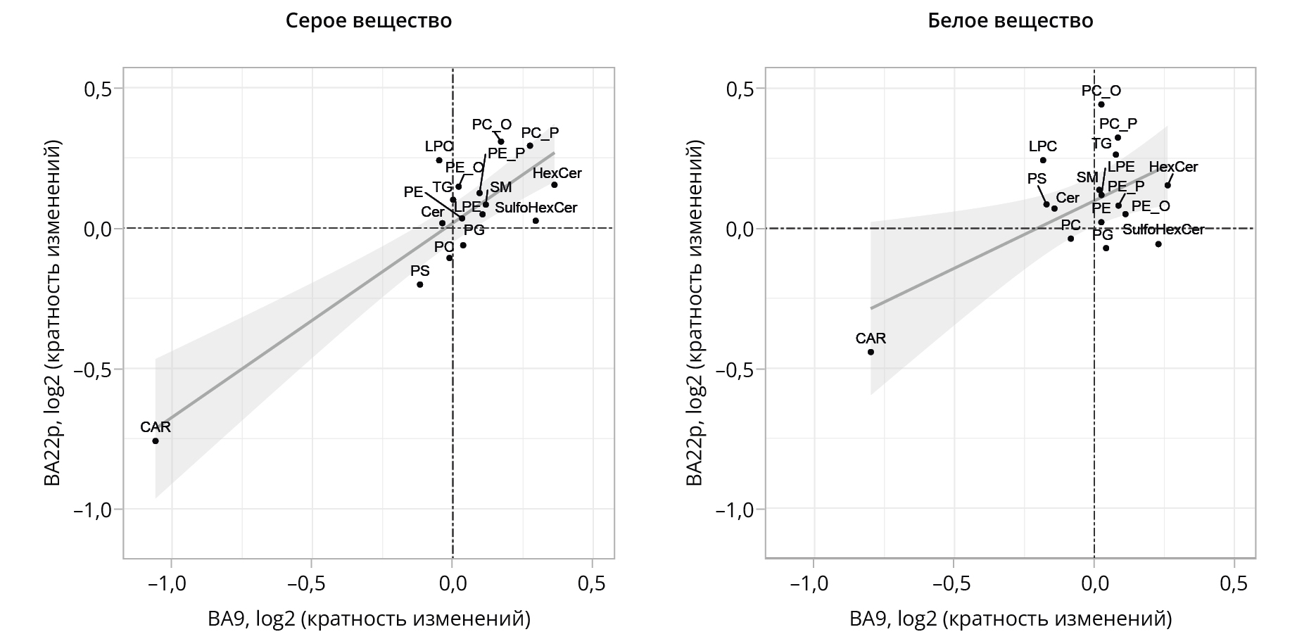 Примечание: Каждая точка обозначает среднюю разницу (кратность изменений) уровней интенсивности липидов между образцами пациентов с шизофренией и контрольными образцами, рассчитанную для всех липидов определенного класса в срезах зоны BA9 (ось x) или BA22p (ось y). Линии линейной регрессии отображали с 95%-ными доверительными интервалами, представленными заштрихованными зонами серого цвета.