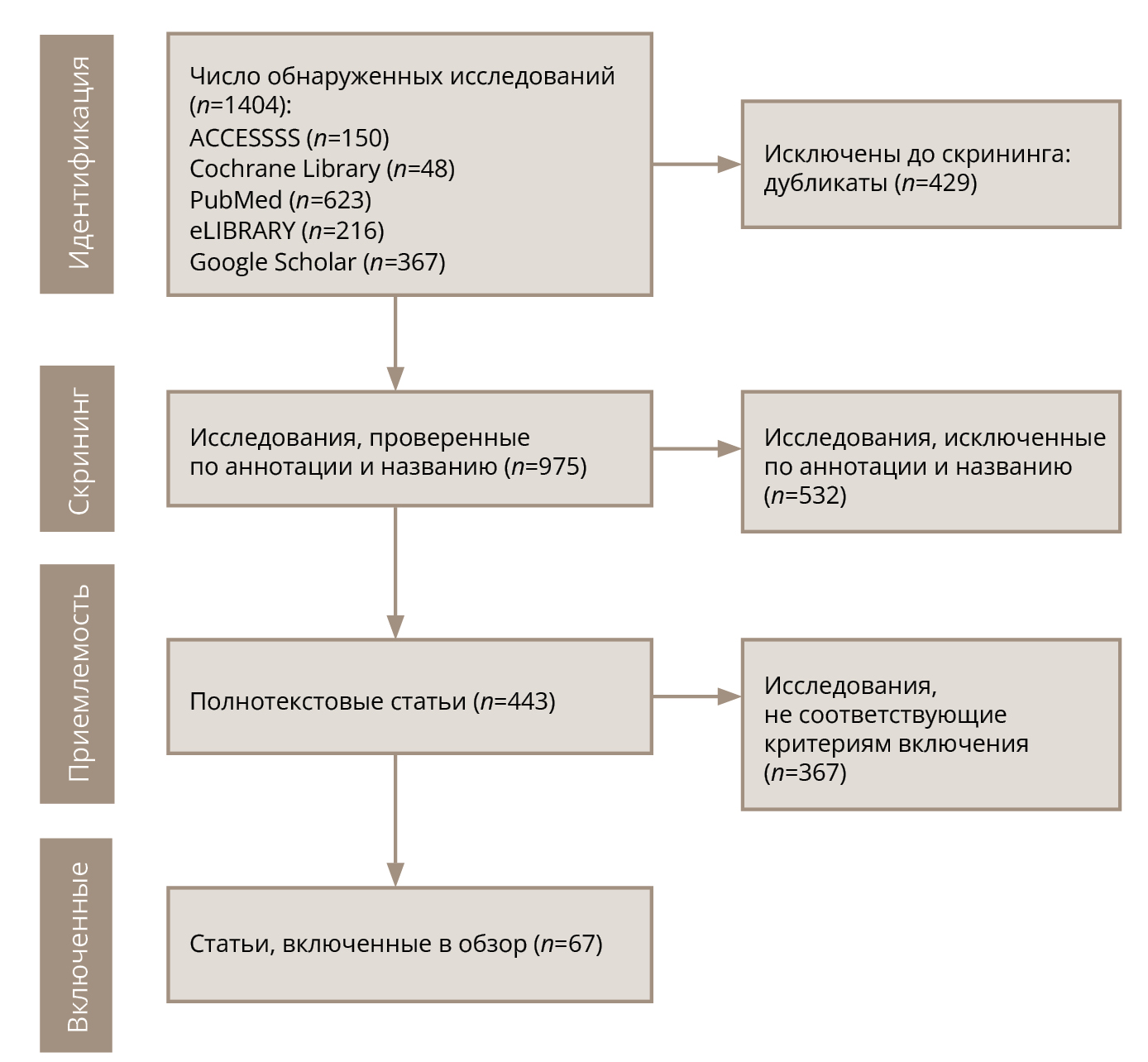 МЕТОДЫ: Поиск данных литературы осуществляли с применением следующих электронных сервисов для поиска публикаций (также указано общее число источников, обнаруженных по искомой теме): ACCESSSS (n=150), Cochrane Library (n=48), PubMed (n=623), eLIBRARY (n=216), Google Scholar (n=367). В итоговое обсуждение было включено 67 публикаций, соответствующих цели работы и опубликованных не ранее 01.01.2018 и не позднее 31.12.2023.