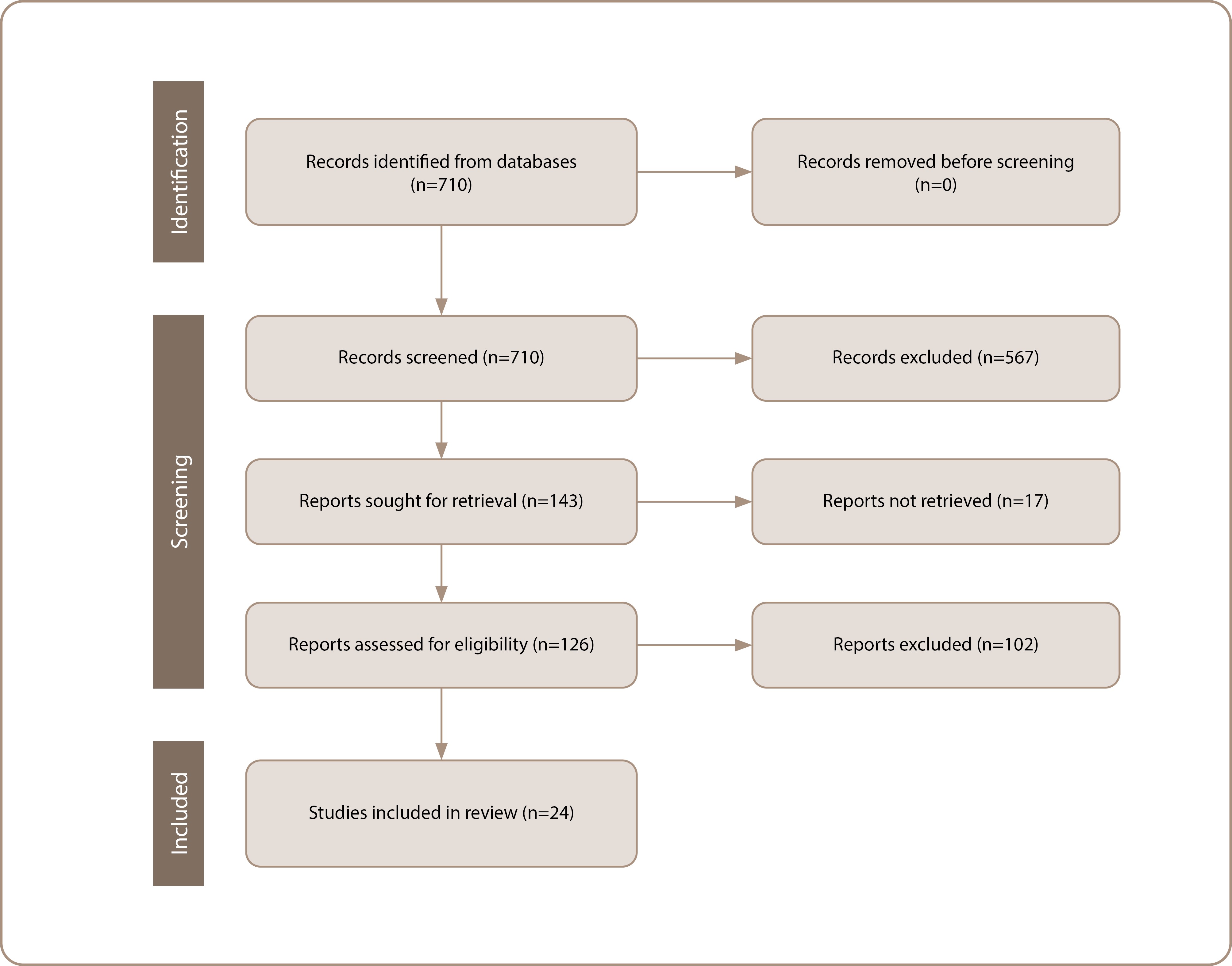 As a result of the database search, 710 articles were netted, all in Medline. After reviewing the titles and abstracts, 143 articles were deemed potentially relevant, of which 126 were publicly available or provided by the authors. After reading the full texts of the articles, 24 original studies that met the eligibility criteria were included in the final analysis (Figure 1) [18, 20, 25–46].