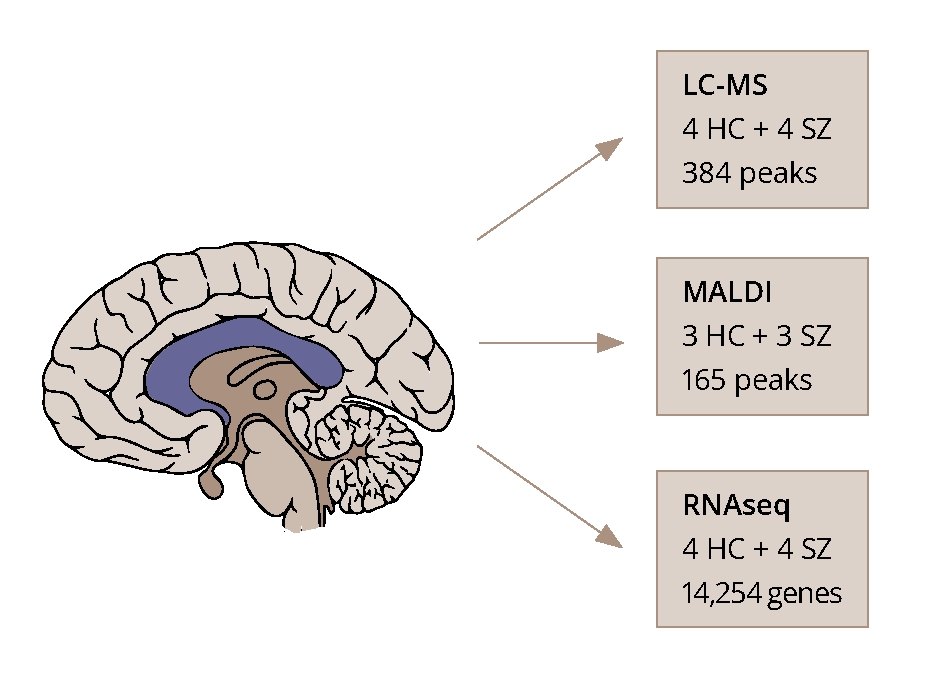 Анализ изменений липидного состава мозолистого тела головного мозга у пациентов с шизофренией, выявленных с помощью двух масс-спектрометрических методов, обнаружил тенденцию к общему снижению уровня липидов для наиболее распространенных классов и согласованность между методами и исследованиями. Среди классов липидов с наиболее заметными различиями были классы, для которых ранее была установлена ассоциация с формированием миелиновой оболочки. Анализ пространственного распределения липидов по срезам мозолистого тела продемонстрировал более однородное распределение в образцах, взятых у пациентов с шизофренией. Функциональный анализ генов также выявил модуль, связанный с липидным обменом.