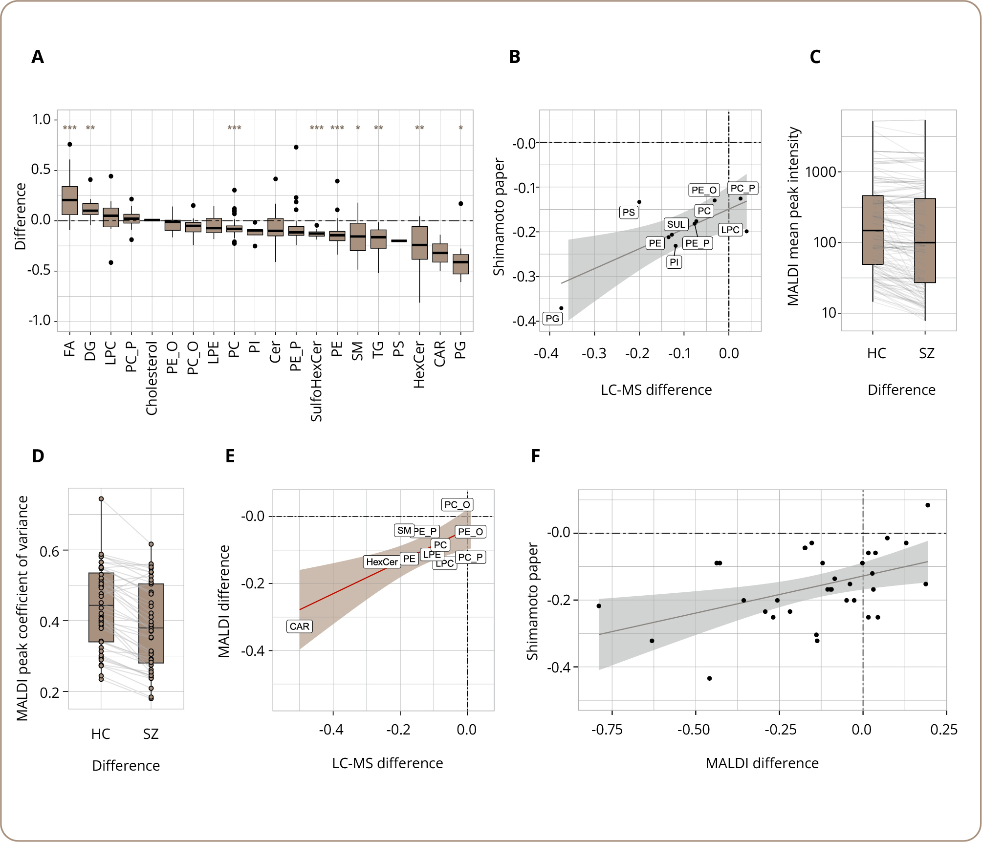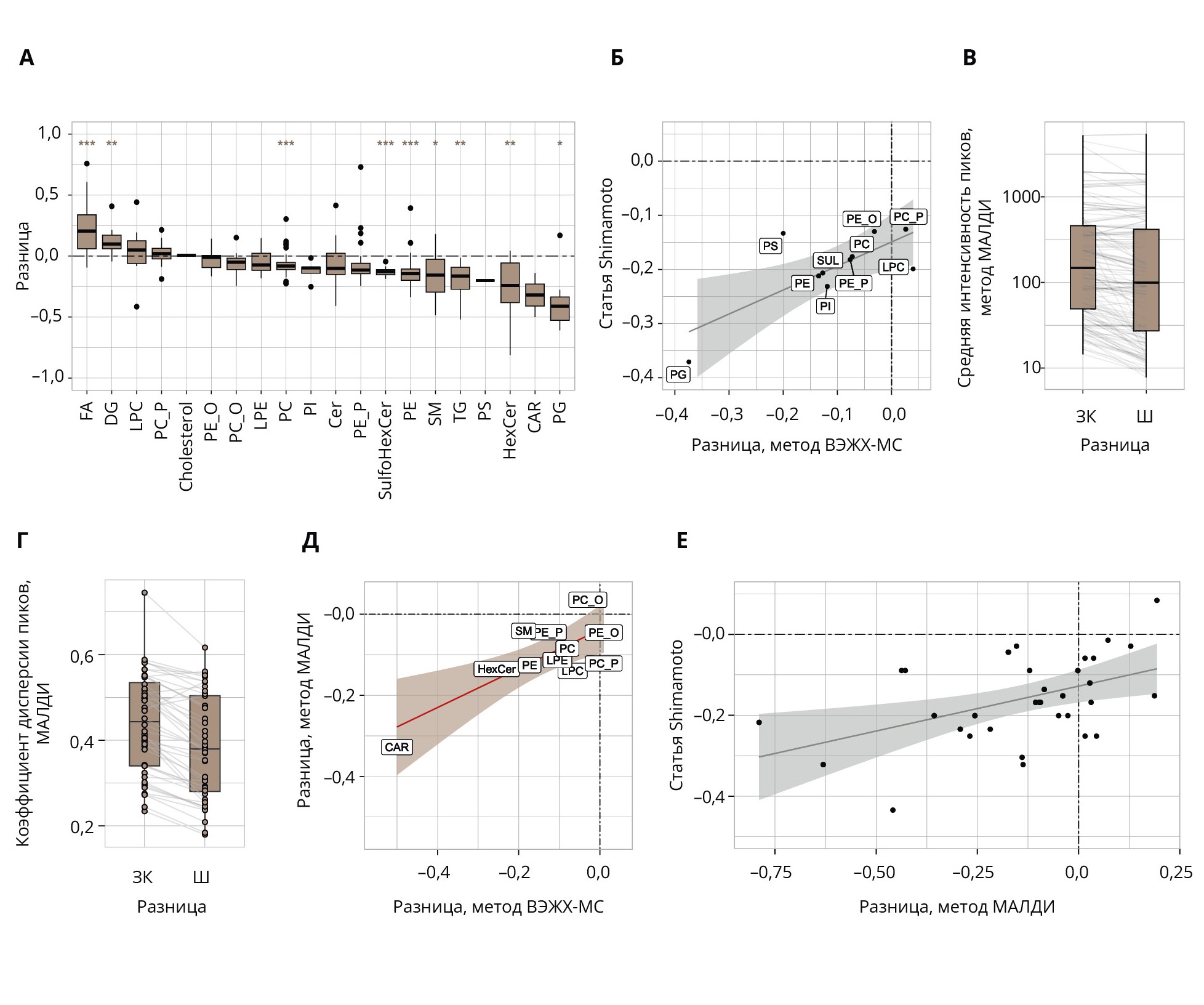 Примечание: (A) Ящичковая диаграмма, отражающая различия в интенсивности липидов между пациентами с шизофренией (Ш) и здоровыми контрольными субъектами (ЗК) для каждого класса липидов, измеренные методом высокоэффективной жидкостной хроматографии с масс-спектрометрией (ВЭЖХ-МС). Звездочки отражают статистическую значимость различий, оцененную с помощью одновыборочного t-критерия Стьюдента для различий между группами по сравнению с нулем для каждого класса (*** p <0,001; ** p <0,01; * p <0,05; значения p скорректированы с учетом множественной проверки гипотез). Положительные значения означают более высокий уровень в группе шизофрении. (Б) Корреляция средних различий для каждого класса липидов с результатами ранее опубликованной работы Shimamoto и соавт. [7] по липидоме мозолистого тела при шизофрении. Корреляция рассчитана на основе общих 10 классов липидов, измеренных в двух работах. (В) Ящичковая диаграмма распределения интенсивности пиков при использовании метода масс-спектрометрической визуализации с использованием матрично-активированной лазерной десорбции/ионизации (МАЛДИ-МС). Каждая линия соединяет один и тот же пик в двух группах образцов. Для оценки того, отличается ли распределение различий между средними значениями пиков в двух группах статистически значимо от нуля, использовали одновыборочный t-критерий Стьюдента (p=0,0013). (Г) Ящичковая диаграмма, показывающая коэффициенты дисперсии, рассчитанные для каждого пика МАЛДИ в каждой группе. Статистическую значимость различий между коэффициентами дисперсии оценивали с помощью знакового рангового критерия Уилкоксона (p <4e-10). Линии соединяют те же интенсивности липидов, усредненные по разным группам. (Д) Корреляция средних различий для каждого класса липидов для двух методик измерений (ВЭЖХ-МС, МАЛДИ-МС). (Е) Корреляция результатов МАЛДИ-визуализации с [7]. Построение пиков основано на сопоставлении масс, одна точка означает один совпадающий пик.