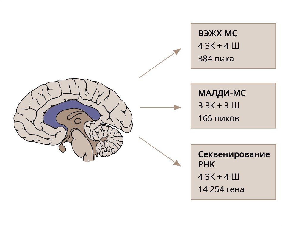 Примечание: Были приготовлены срезы мозолистого тела, и эти образцы были использованы для 3 типов измерений: высокоэффективной жидкостной хроматографии с масс-спектрометрией (ВЭЖХ-МС), масс-спектрометрической визуализации с использованием матрично-активированной лазерной десорбции/ионизации (МАЛДИ-МС) и секвенирования РНК (RNAseq). Представлено количество признаков, обнаруженных при каждом типе анализа. ЗК — здоровые контрольные субъекты; Ш — пациенты с шизофренией.