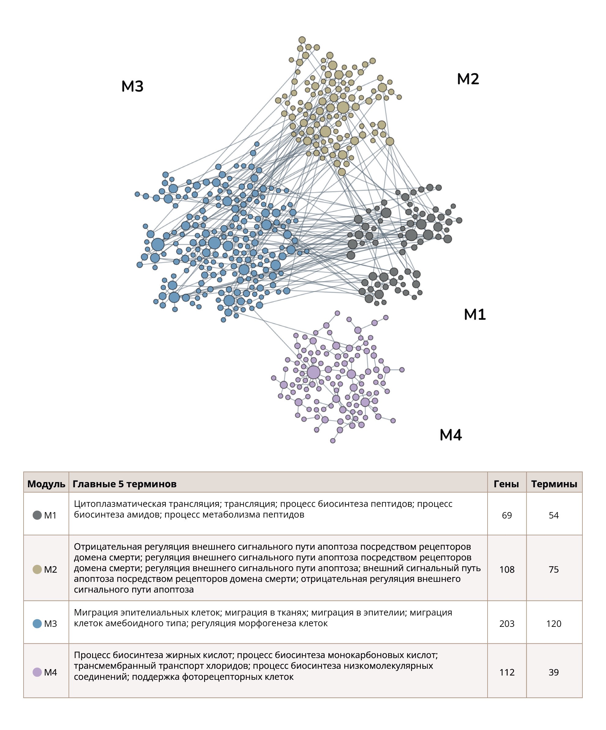 Анализ 14 254 транскриптов в образцах мозолистого тела выявил 1202 (8,4%) дифференциально экспрессированных гена между группами Ш и ЗК (см. табл. S4 в Приложении). Из анализа были исключены 20 генов из 1202 по причине отсутствия информации о них в базе данных HumanBase. В результате были идентифицированы 4 функциональных модуля, в которые вошли 492 из обнаруженных генов (рис. 3; см. табл. S5 в Приложении). Основные клеточные функции модуля M1: цитоплазматическая трансляция, трансляция, процесс биосинтеза пептидов, процесс биосинтеза амидов, процесс метаболизма пептидов; модуля M2: отрицательная регуляция внешнего сигнального пути апоптоза посредством рецепторов домена смерти, регуляция внешнего сигнального пути апоптоза посредством рецепторов домена смерти, регуляция внешнего сигнального пути апоптоза, внешний сигнальный путь апоптоза посредством рецепторов домена смерти, отрицательная регуляция внешнего сигнального пути апоптоза; модуля M3: миграция эпителиальных клеток, миграция в тканях, миграция в эпителии, миграция клеток амебоидного типа, регуляция морфогенеза клеток; модуля M4: процесс биосинтеза жирных кислот, процесс биосинтеза монокарбоновых кислот, трансмембранный транспорт хлоридов, процесс биосинтеза низкомолекулярных соединений, поддержка фоторецепторных клеток.