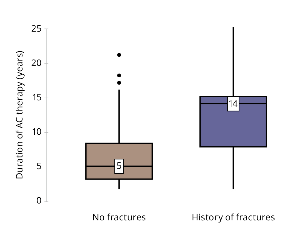 To more accurately determine the relationship between the probability of fractures and the duration of anticonvulsant therapy, a ROC analysis was performed (Figure 4).