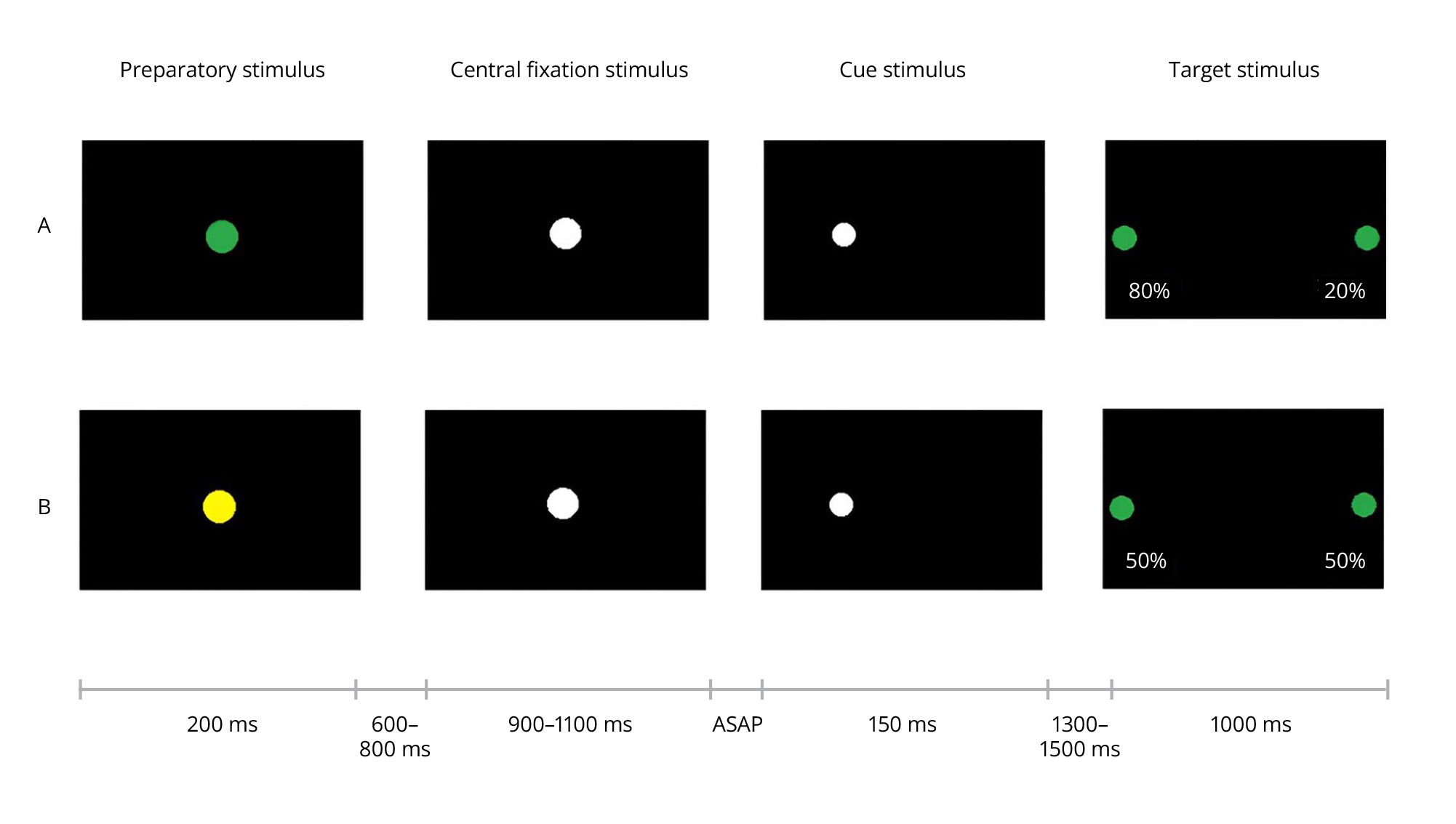 Note: ASAP — as soon as possible; A — the target stimulus appears on the same side as the cue stimulus in 80% of the cases; B — the target stimulus appears on the same side as the cue stimulus in 50% of the cases.