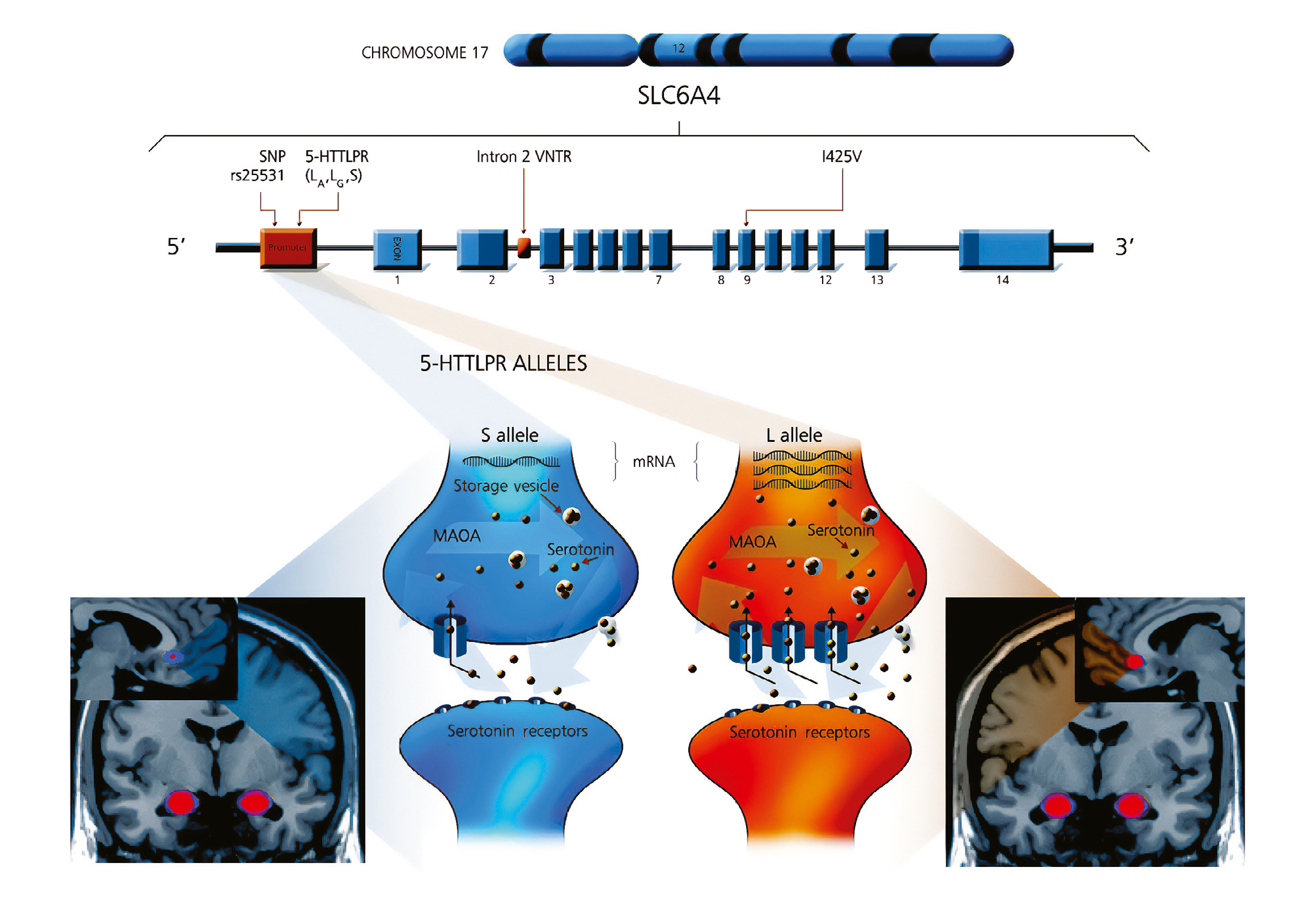 Note: 5-HTTLPR — serotonin transporter-linked polymorphic region; CHROMOSOME 17 — the 17th human chromosome, which contains the SLC6A4 gene; Intron 2 VNTR — variable number tandem repeat); МАОА — monoamine oxidase A; mRNA — messenger RNA; rs25531 — is the identifier for a single nucleotide polymorphism (SNP) in the SLC6A4 gene, which affects the expression of the transporter; SNP — single nucleotide polymorphism.