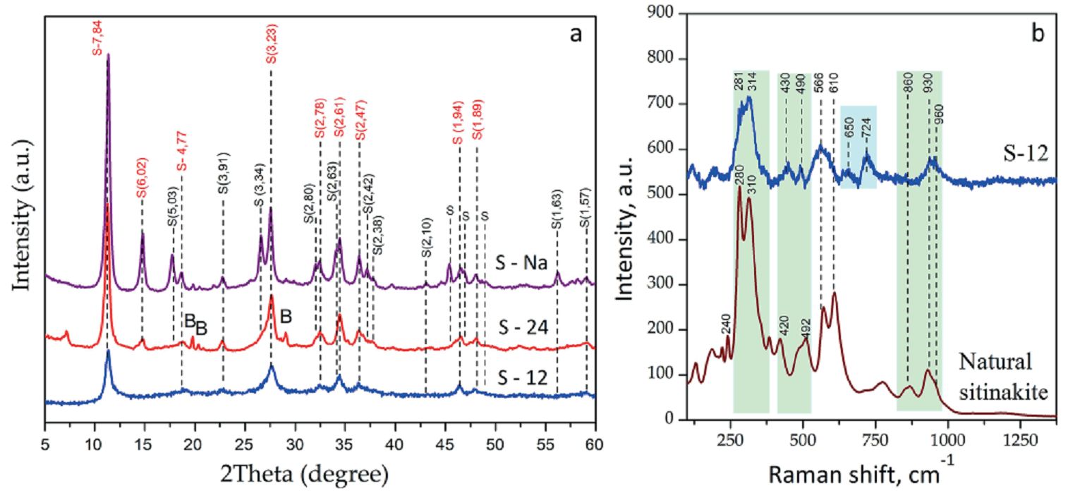 Fig. 1. XRD patterns (a) and Raman spectra (b) of titanosilicate with sitinakite structure (B –vinogradovite, S — sitinakite)