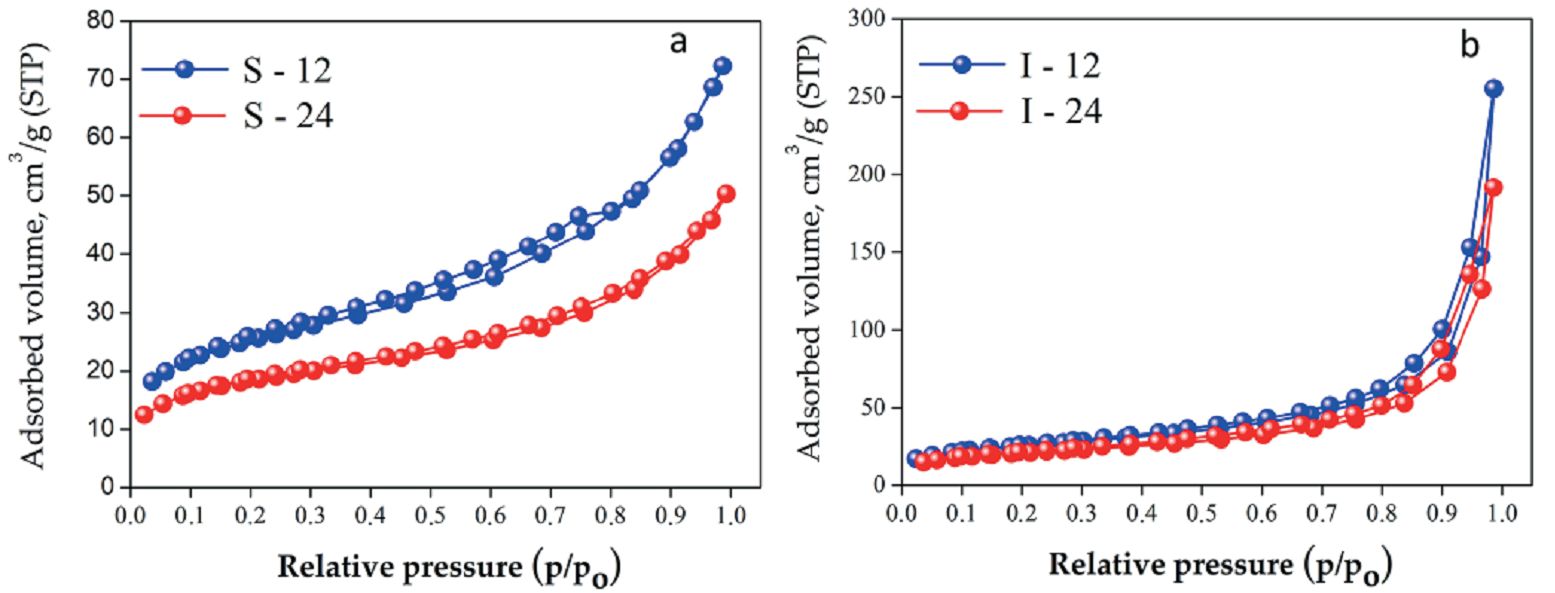 В табл. 2 представлены текстурные характеристики синтезированных порошков. Видно, что увеличение кристалличности продуктов синтеза приводит к снижению удельной поверхности. Обращает на себя внимание форма изотерм, представленная на рис. 3. Все изотермы можно отнести к типу IVa, при этом формы петель гистерезиса различаются (Thommes, 2015). В образцах ситинакита S-12, S-24 форма петли гистерезиса близка к типу H3 (рис. 3, b), что свидетельствует о наличии щелевидных капилляров, образованных параллельными пластинами (частицами порошка). Этим можно объяснить высокие значения общего объема пор в ситинаките. В образцах I-12, I-24 форма петель гистерезиса соответствует типу Н4 (рис. 3, a).