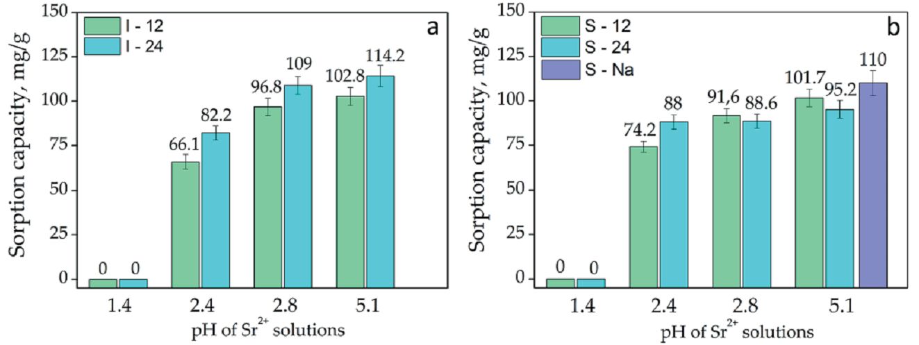 Установлено, что при рН = 1.4 сорбционная емкость всех образцов титаносиликатов по Sr2+ составляет 0 мг/г (рис. 5). С изменением рН до 2.4 сорбционная емкость титаносиликатов возрастает, достигая значений 66–88 мг/г для иванюкита и 74–88 мг/г для ситинакита. Максимальные значения сорбционной емкости образцов титаносиликатов выявлены при рН = = 5.1. В образцах ситинакита наблюдается следующая тенденция: материал, синтезированный в течение 24 ч, имеет меньшую СОЕ по сравнению с материалом, синтезированным в течение 12 ч. Максимальная СОЕ образца S-12 составляет 102 мг/г, образца S-24 — 95 мг/г. Вероятно, это происходит из-за более высокого содержания примесной фазы виноградовита в образце S-24. В образцах иванюкита видна противоположная тенденция — более кристалличные образцы имеют более высокую СОЕ по сравнению с менее кристалличными.