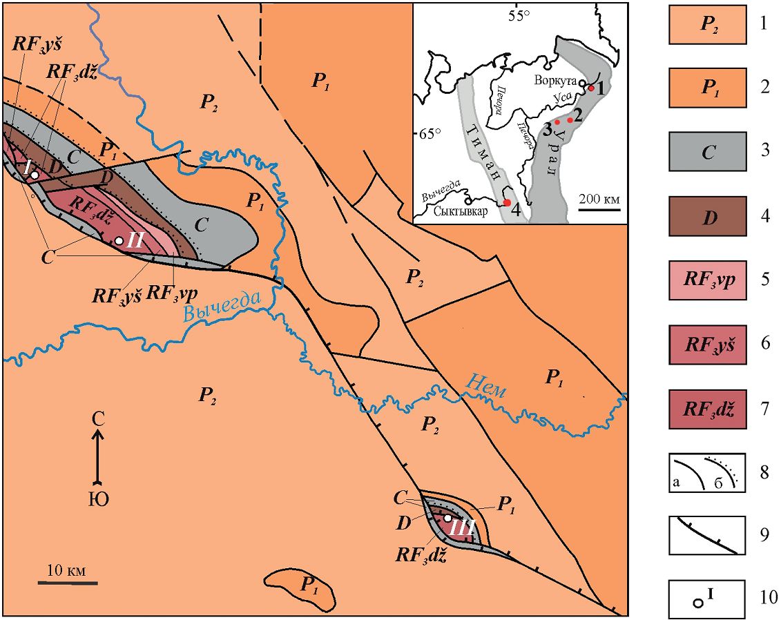 Legend: 1–2 Permian system: 1– lower section, limestones, dolomites, siltstones, sandstones, gypsum; 2 — upper section, clays, limestones, sandstones; 3 — carboniferous system: limestones, dolomites, clay limestones, clays; 4 — Devonian system, middle-upper divisions: gravelites, sandstones, conglomerates, siltstones; 5–7 — Riphean erathema: 5 — Vapol formation: dolomites with interlayers of sandstones, mudstones and flints; 6 — Oykemess formation: dolomites, siltstones, mudstones; 7 — Dzhezhim formation: sandstones, siltstones, gravelites; 8 — geological boundaries: a — consonant, b — dissent; 9 — thrust; 10 — studied sections: 1 — Engane-Pe ridge; 2 — Kacha-Mylk ridge; 3 — Dgelyau river; 4 — Zhezhimparma and Nem Hills; I — Asyvvozh quarry; II — Dzhezhim quarry; III — Vad`ya-Vozh quarry