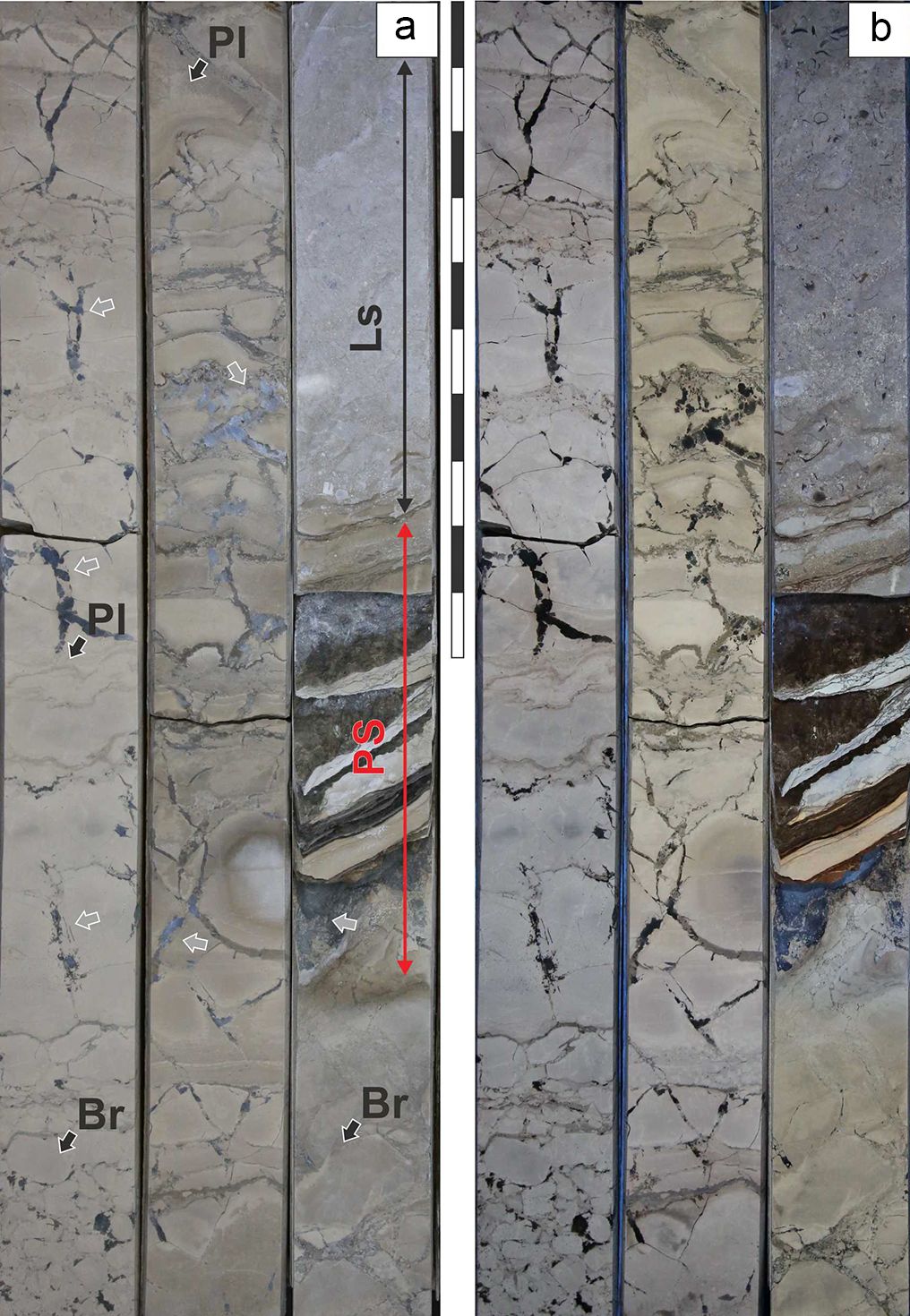 Рис. 2. Следы растворения сульфатов в доломитах подольского горизонта. Фото керна в дневном (a) и ультрафиолетовом (b) свете. Br - брекчированные прослои, Pl - текстуры пластической деформации, PS - палеопочва, Ls - известняк, серыми стрелками показаны включения ангидрита. Цена деления линейки - 5 см