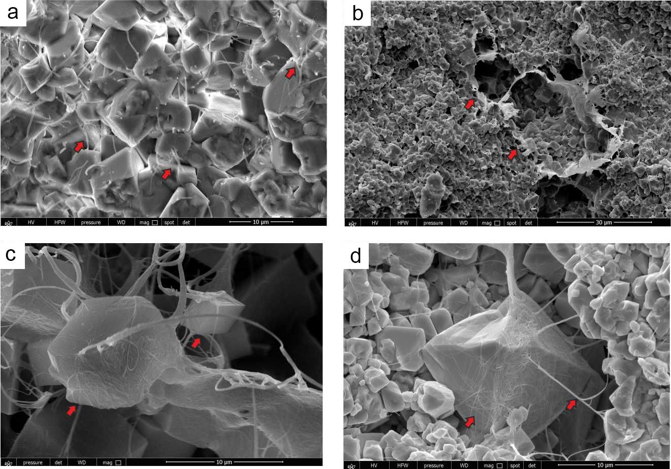 Рис. 4. Доломиты и сепиолиты (изображения РЭМ): a - нити сепиолитов (стрелки), развитые между кристаллами доломита; b - пленки сепиолитов (стрелки), развитые по границам пустот в доломите; c - кристаллы галита (стрелки), «подвешенные» на нитях сепиолита; d - кристалл доломита, окутанный плотной сетью из нитей сепиолита