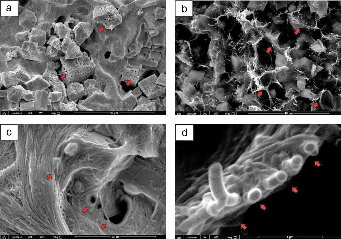 Fig. 5. SEM images of samples after etching with hydrochloric acid: a — lattice structure of dolomite crystals (arrows); b — honeycomb-like structure of sepiolite films (arrows); c, d — bacteriomorphs of sepiolite composition (arrows)