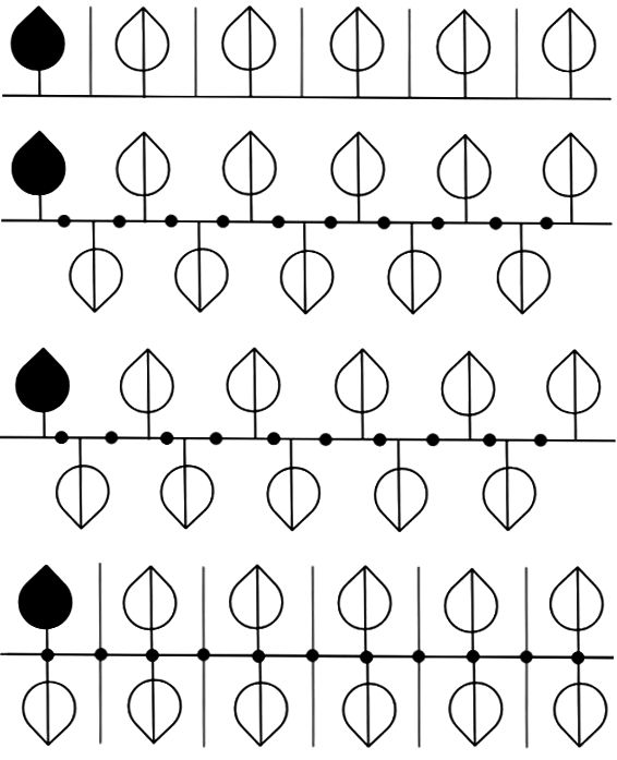 Кристаллографические бордюры - односторонние орнаменты. Именно это позволяет использовать их для описания ритмичных расположений листьев (у которых верхняя, то есть обращенная к солнцу, сторона радикально отлична от нижней) на горизонтальной ветке, когда все они условно лежат в одной плоскости. Но возможны варианты: 1) лист расположен косо к ветке по ходу ее роста, и тогда неважно, симметричен он или асимметричен; 2) лист ортогонален к ветке, и тогда важно, он симметричен (2а) или асимметричен (2б). Случай 1 согласуется с бордюрами Т, Т* и РТ (рис. 2). Черным показан лист, с которого начинается построение бордюра. Другие варианты противоречивы - в них правильное положение листа сочетается с обратным. В случае 2а лист состоит из асимметричных половинок, связанных плоскостью П, и с точки зрения теории бордюров должен рассматриваться как кластер. Он сочетается с бордюрами ПТ, ПТ*, СТ и РПТ (рис. 3). Бордюры ПТ* и СТ похожи. Но в ПТ* каждый нижний (верхний) лист расположен строго посередине между верхними (нижними). В СТ кластер из двух противоположно ориентированных листьев транслируется на произвольный шаг. Случай 2б с точки зрения симметрии сводится к варианту 1.
