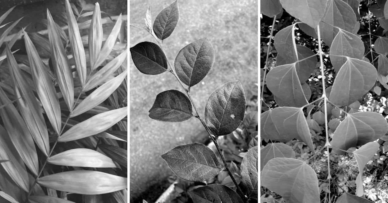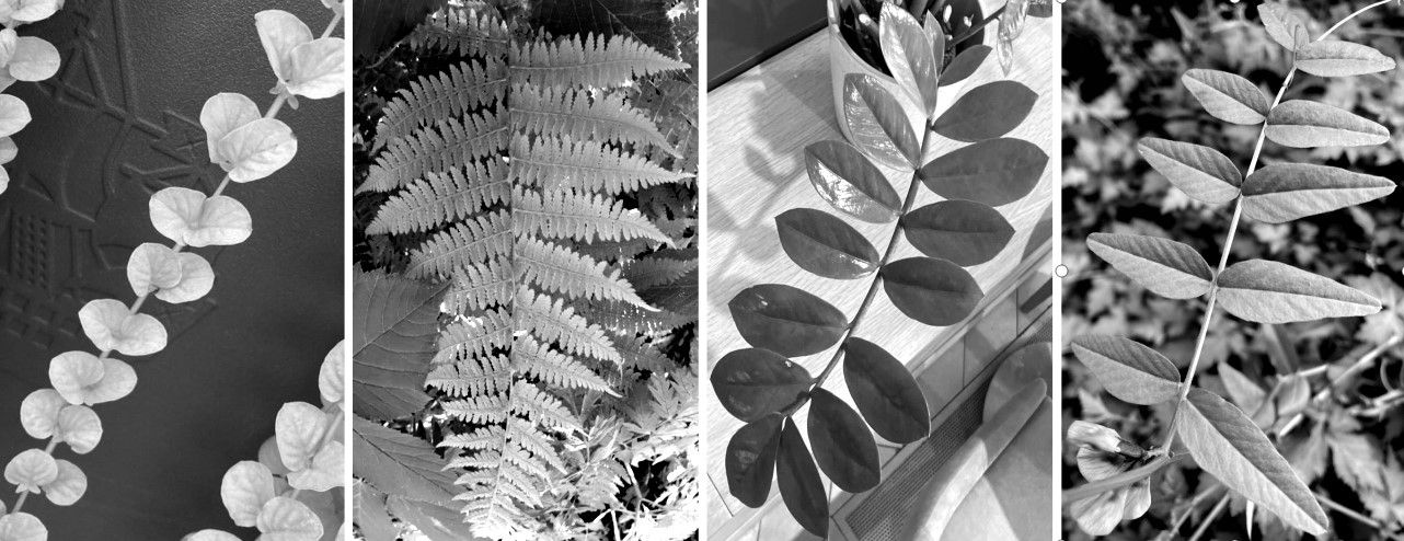 Рис. 6. Чередование типов расположения (слева направо): T* → T* - кизильник (Cotoneáster sp.), РПT → РПT - бузина чёрная (Sambúcus nigra), ПT* → [CT + РПТ] - робиния псевдоакациевая (Robinia pseudoacacia), Т* → [РПТ → ПТ* → Т*] - кочедыжник женский (Athyrium filix-femina)