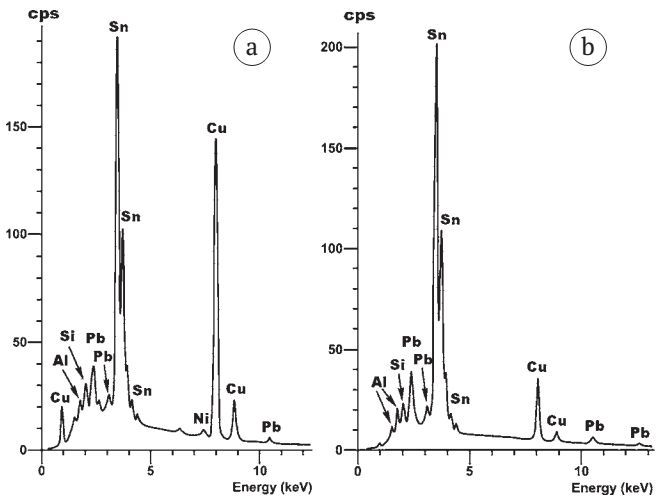 Fig. 3. ED spectra obtained from the main mass (a) and Pb-Cu-As inclusions (b) in a copper bracelet