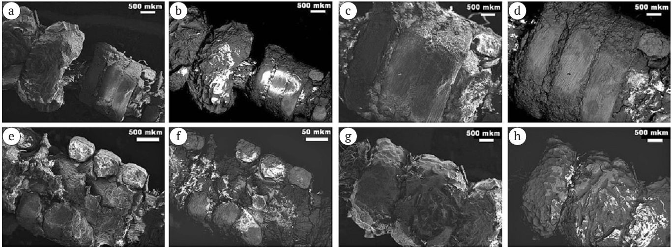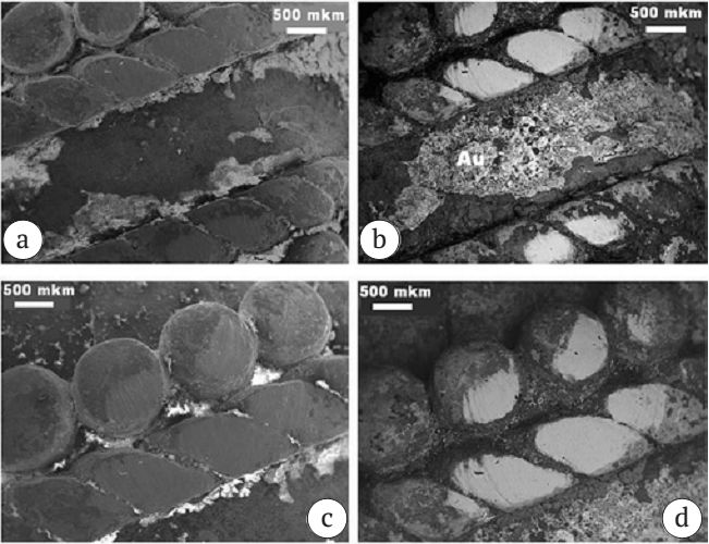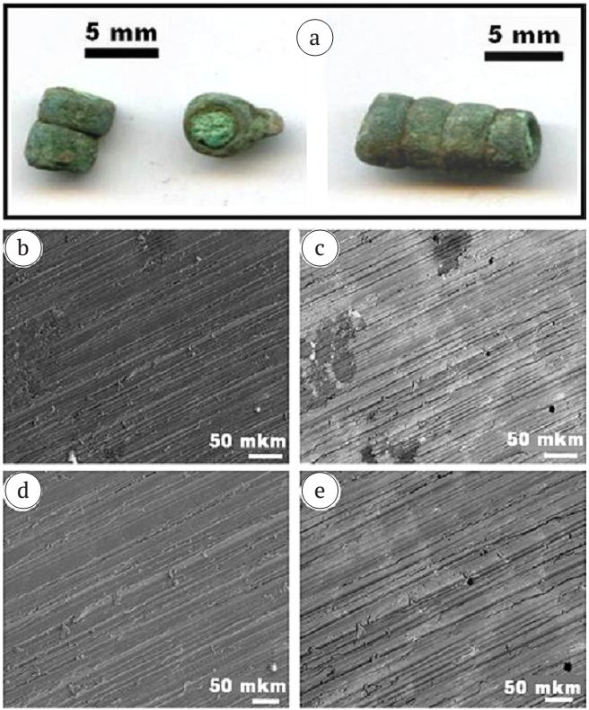 - Кольцевидные бусины. Фрагменты окисленных с поверхности бронзовых украшений длиной 6.5—12 мм; диаметром от 4 до 5.5 мм (рис. 6; а). В основной массе (рис. 6; b—e) выявлены две разновидности бронз (табл. 4): преобладающая низкооловянистая состава Cu0.95—0.98 Sn0.01—0.05Pb0—0.01 и умеренно оловянистая Cu0.91—0.92 Sn0.07Pb0—0.01. В бронзах встречаются единичные микровключения состава Pb0.56—0.88Cu0.12—0.37Sn0—0.07 (рис. 7). Поверхность бусин подверглась окислению; что; очевидно; и придало бусинам зеленый цвет.