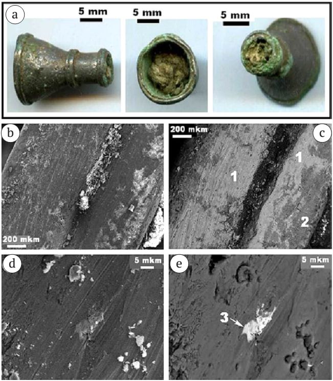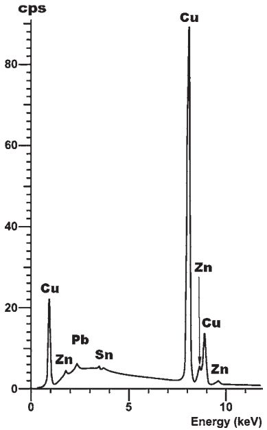 - Грушевидный бубенчик с крестообразной прорезью. Украшение длиной 12.5 мм и диаметром основания 14 мм (рис. 16; а); массивное (рис. 16; b—e); из оловосодержащей латуни (рис. 17; табл. 10) — Cu0.89—0.94Zn0.05—0.08Sn0.01—0.02Pb0—0.01. В латунной массе спорадически встречаются угловатые микровключения размером от 1 × 0.5 до 5 × 2 мкм; подразделяющиеся по составу на медные — Cu0.98—0.99Pb0—0.01Sn0—0.01 и свинцово-медные — Cu0.73Pb0.27.