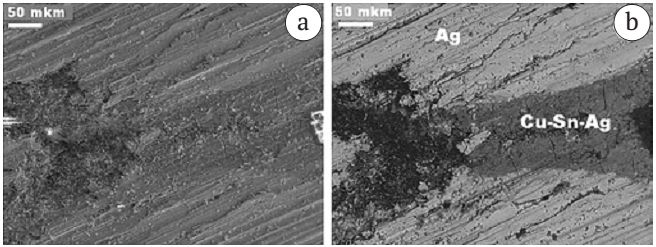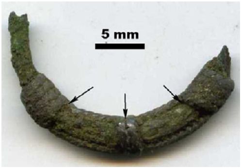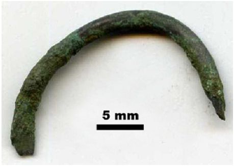 - Фрагмент браслета размером 64 × 5 × 1.5 мм (рис. 2; а); по составу почти нацело медный — Cu0.98—1 Sn0—0.02 (рис. 3; табл. 1). Под СЭМ характеризуется тонкопластинчатым строением (рис. 2; b; c); что является; вероятно; следствием ковки. Однородность нарушается множеством фазовых микровключений размером от 5—10 до 20—25 мкм; подразделяющихся по составу на свинцово-медно-мышьяково-сурьмяные Pb0.38—0.57Cu0.15—0.25Sn0—0.02As0—0.19Sb0.08—0.44S0—0.03 и свинцово-медно-никелево-сульфоантимонидные — (Pb1.16—1.35Cu0.74—1Ni0—0.06)2.15—2.22(Sb0.74—0.87S0.13—0.16).