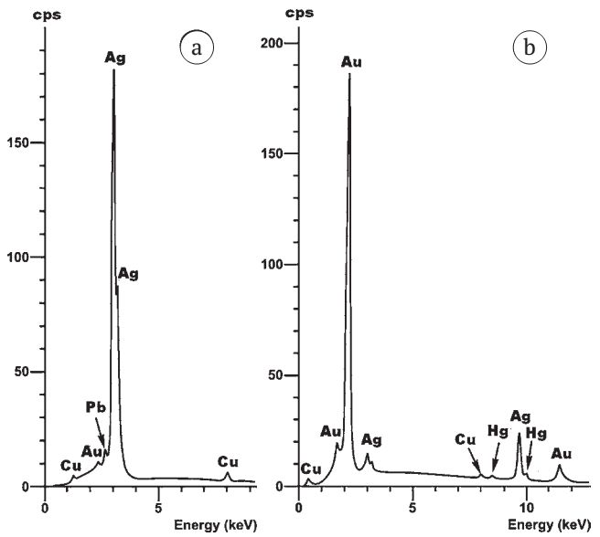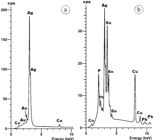 Fig. 29. ED spectra obtained from the main mass (a) and gold-plated areas (b) in barrel bead