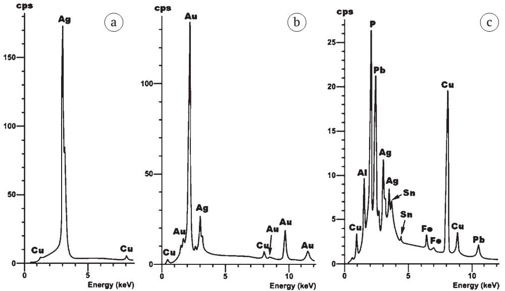 Fig. 32. ED spectra obtained from the main mass (a); gold-plated areas (b) and superficial microcrust (c) in an acorn-shaped bead