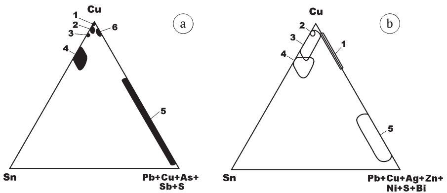 Fig. 33. Triangular diagrams of the chemical composition of non-ferrous metal phases in the studied items and decorations from burials No. 59 (a) and No. 115 (b) of the Kokpomyag burial ground: 1 — native copper; 2—4 — bronzes; respectively; low-; moderate-; high-tin; 5 — metal inclusions in bronzes; 6 — brass