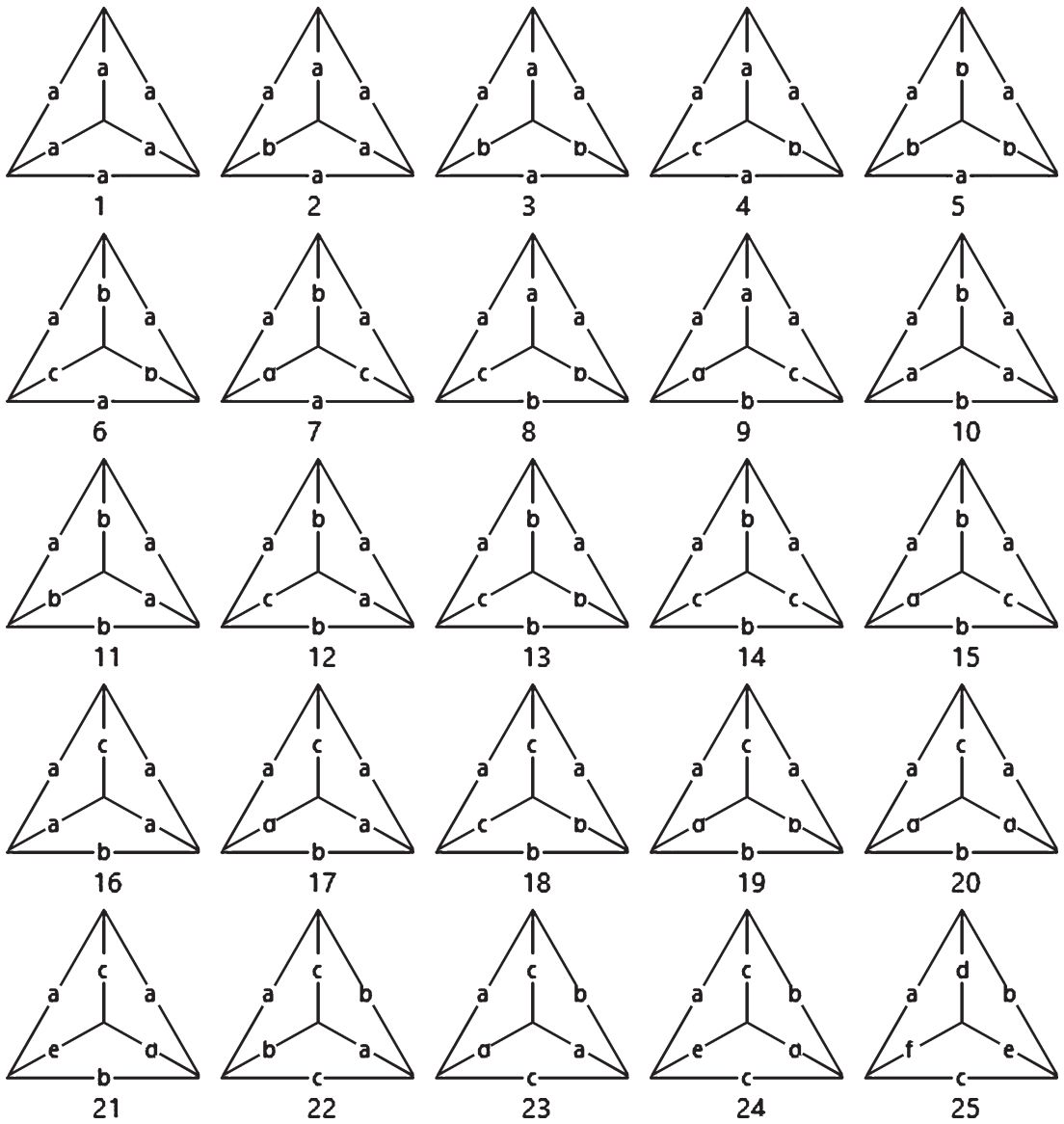 Перебор остальных вариантов удобно вести в порядке «убывания»: с равносторонними гранями; потом без них; но с равнобедренными; наконец; только с разносторонними. Восстановим ли тетраэдр по коду? Не всегда: [400] — заведомо кубический; но [040] — не обязательно тетрагональный. В одном типе следует различать (совместимо или зеркально) равные и разные грани. Так; в форме [0.2 + 2.0] есть 2 пары равнобедренных граней; в [0.2 + 1 + 1.0] — пара и 2 уникальные. Всего таких (комбинаторно-геометрических) символов можно составить 51. На рис. 1 даны только геометрически реализуемые варианты. Ребра равной (разной) длины отмечены одинаковыми (разными) буквами.