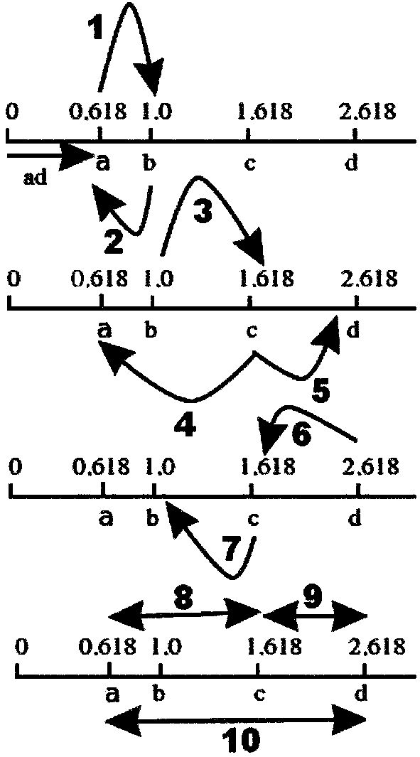 Рис. 1. Схема вывода золотых пропорций самоорганизующихся динамических систем. В точках a, c, d динамические системы находятся в состоянии устойчивого динамического равновесия. В точке b они могут находиться в состоянии равновесности (стагнации). Вектор ad определяет стадии состояния систем, в точках a, c, d которого периодически могут возникать условия устойчивого динамического равновесия как при развитии систем, так и при их деградации (векторы 1—10)
