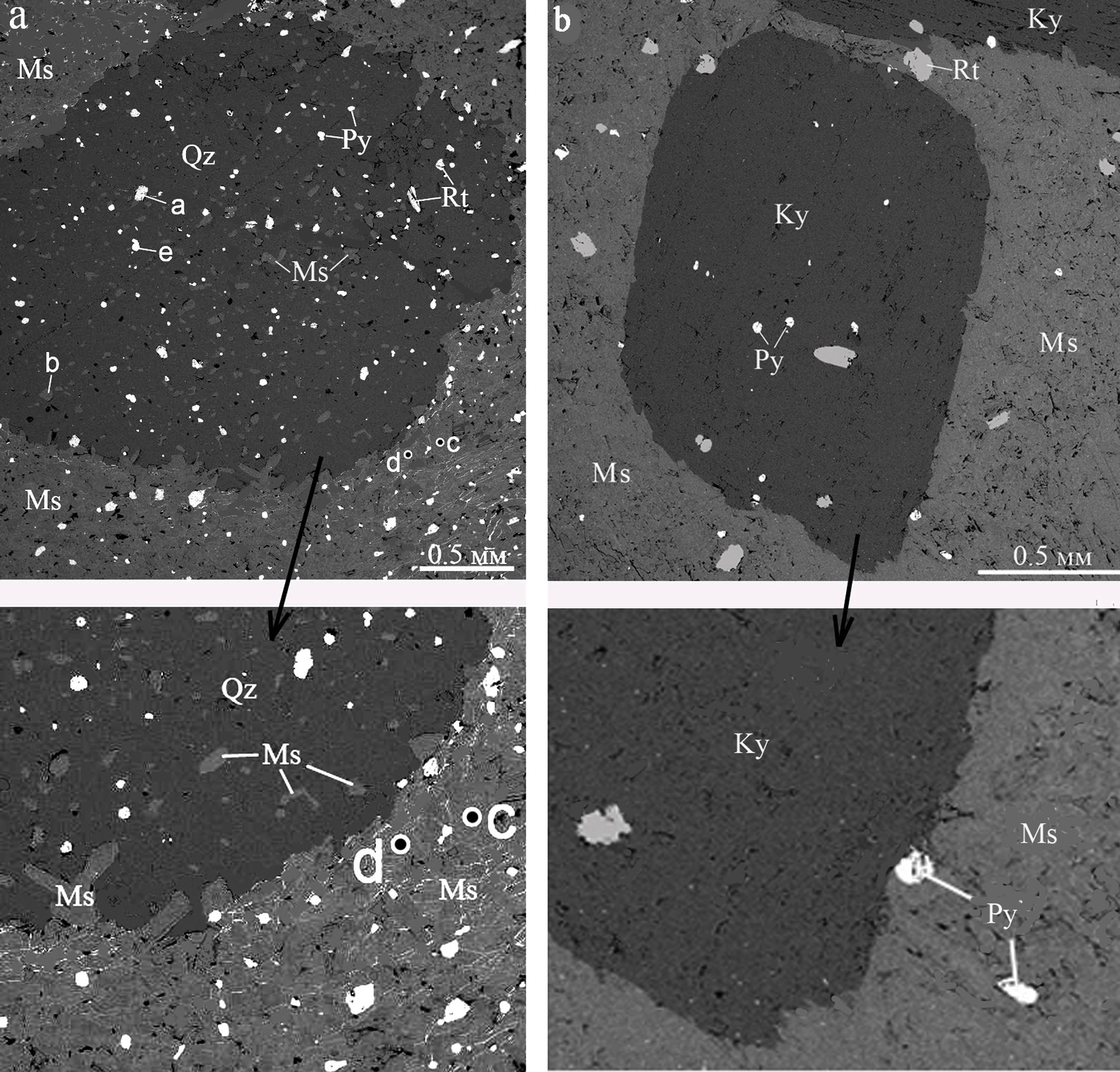 Fig. 5. Distribution of muscovite (Ms) in mica: a — saturation in quartz grains (Qz); b — absence of muscovite in kyanite individuals (Ky). Illustration of the phenomenon of crystallization of differently charged minerals from a liquid medium. BSE-photo
