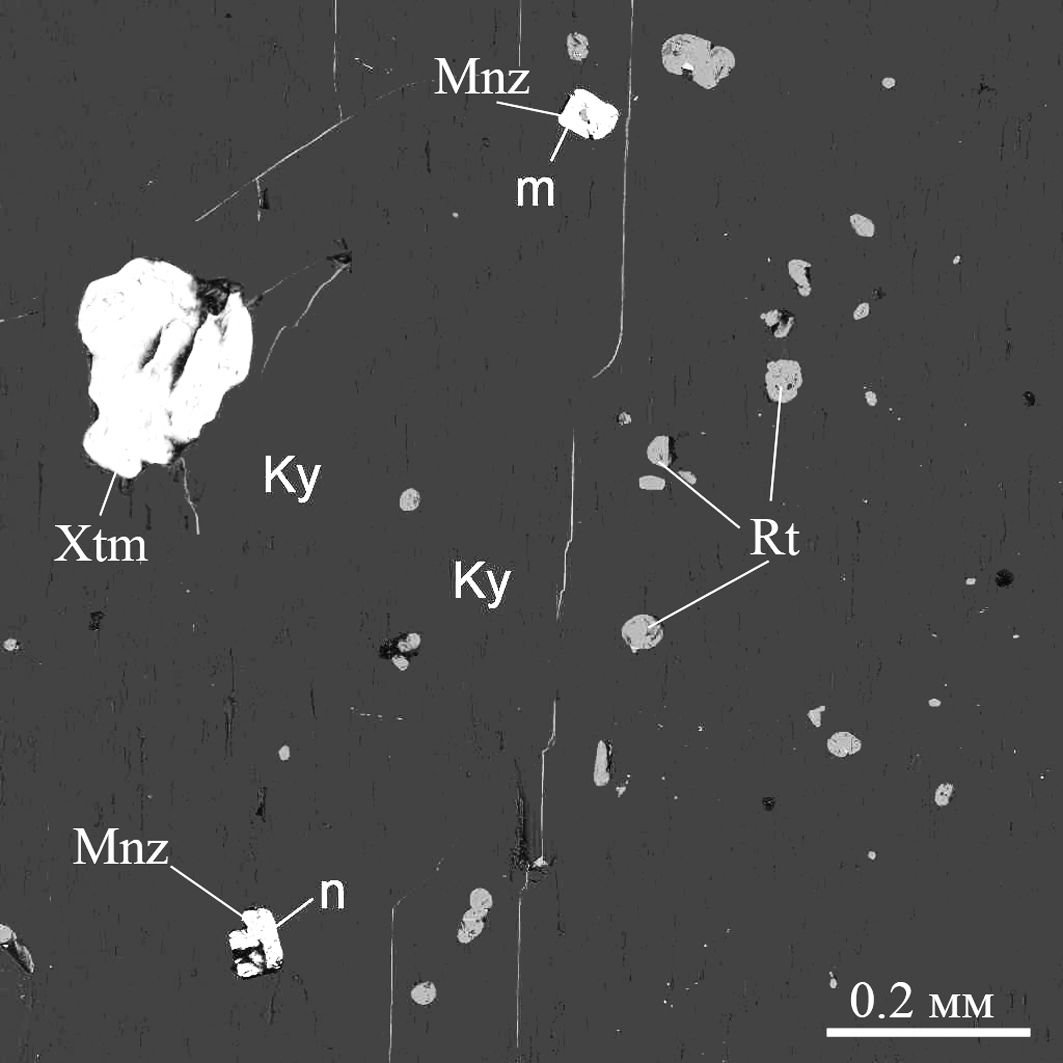 Fig. 6. Synchronous inclusions of rutile (Rt), monazite (Mnz) and xenotime (Xtm) in kyanite (Ky). BSE-photo