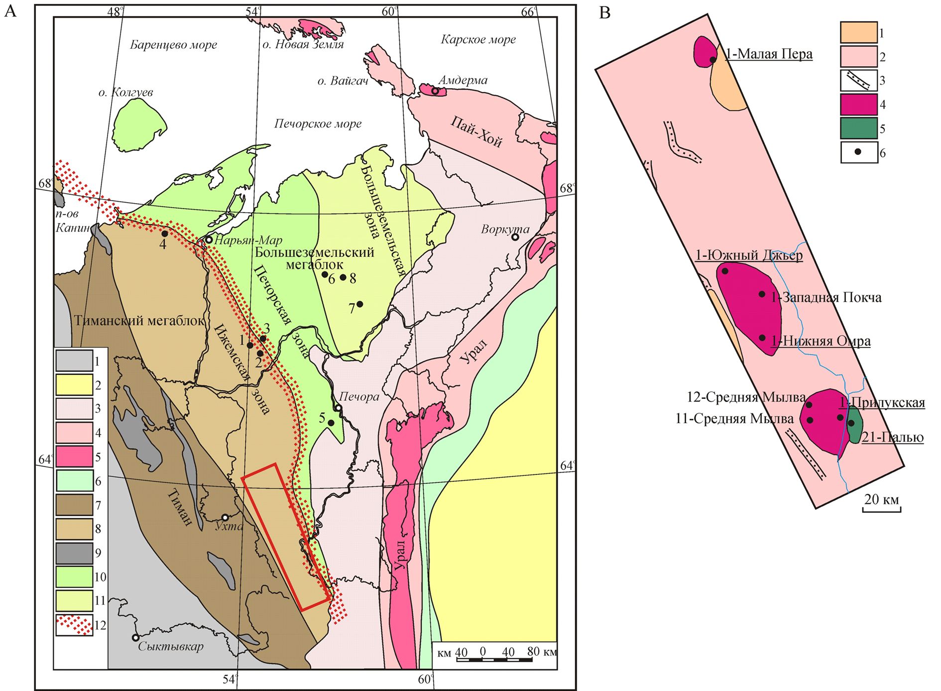 На основании геофизических данных и результатов бурения в составе фундамента Тимано-Печорской плиты по вещественному составу и характеру магматизма выделяются Тиманский мегаблок, включающий собственно Тиман и прилегающую к нему с северо-востока Ижемскую зону, и Большеземельский мегаблок в составе Печорской и Большеземельской зон (Дедеев и др., 1974; Белякова, 1983; Дедеев, Запорожцева, 1985; Белякова и др., 2008). Граница между мегаблоками проводится по Припечорской разломной зоне, состоящей из Чаркаю-Пылемецкого и Илыч-Чикшинского глубинных разломов, простирающихся в северо-западном направлении от Урала до Печороморской впадины (Костюченко, 1994; Оловянишников и др., 1996). Разломы, не выраженные на поверхности, зафиксированы по положительной магнитной аномалии, именуемой Припечорской (Гафаров, 1970). Ее связь с изверженными породами подтверждается результатами глубокого бурения.