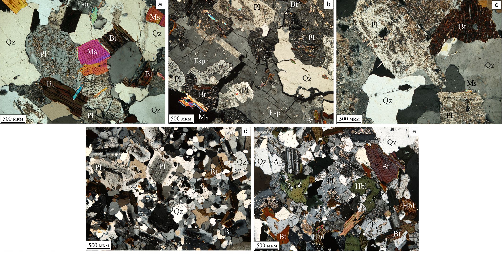 Fig. 2. Thin-section photomicrographs in cross polarized light from boreholes: a — 1-Nizhnyaya Omra (sample 125), b — 1-Prilukskaya (sample 33), c — 11-Malaya Pera (sample 22), d — 1-South Djier (sample 19), e — 21-Palyu (sample 30-11). Qz — quartz, Pl — plagioclase, Fsp — alkali feldspar, Bt — biotite, Hbl — hornblende, Ms — muscovite, Ap — apatite