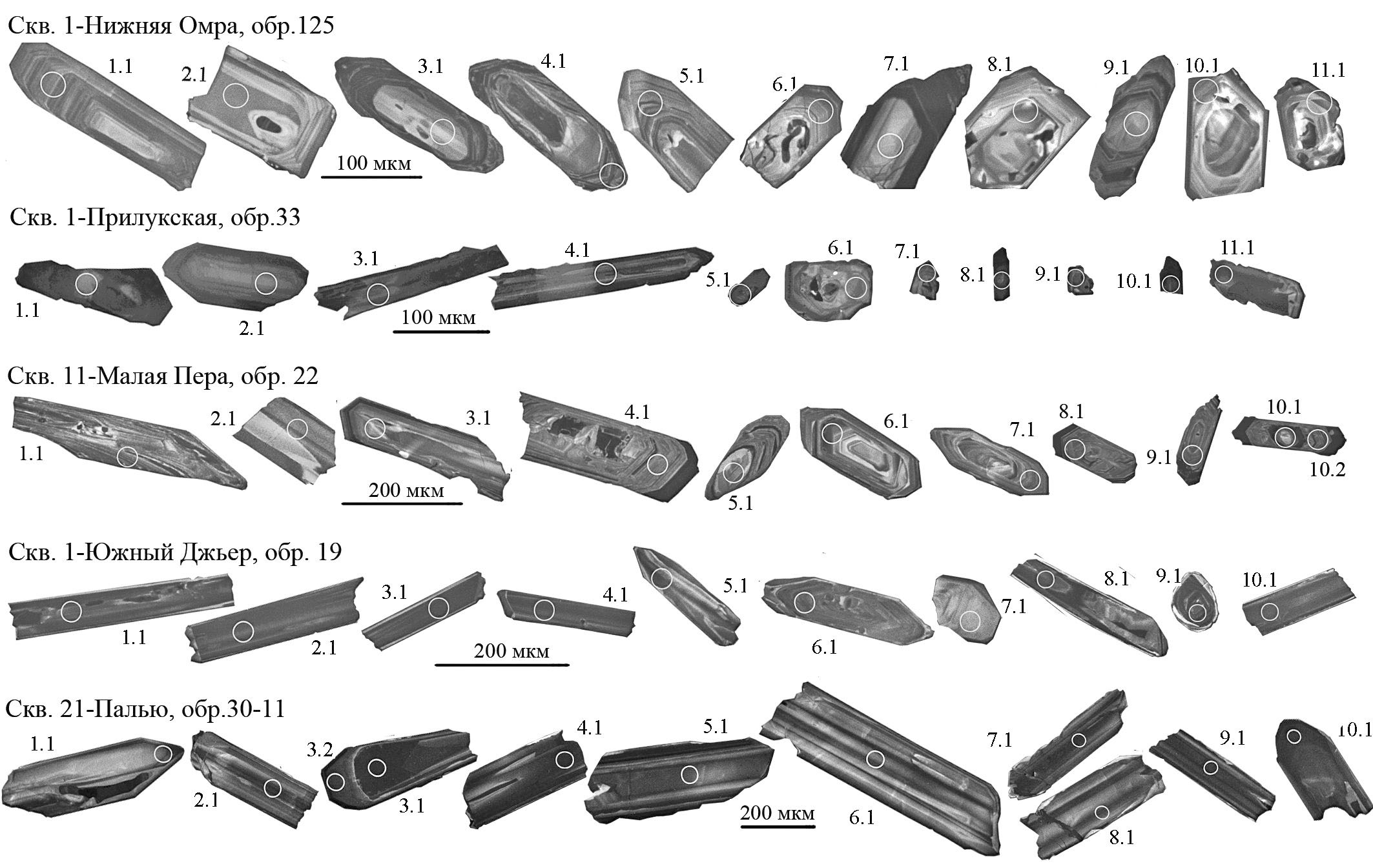 U-Pb-датирование единичных зерен циркона из скважин 1-Нижняя Омра, 11-Малая Пера, 1-Южный Джьер и 21-Палью проводилось в Центре изотопных исследований Института Карпинского (Санкт-Петербург) на ионном микрозонде SHRIMP-IIe, а изображения внутренней структуры цирконов получены на сканирующем электронном микроскопе CamScan MX2500 c катодолюминесцентной системой CLI/QUA2. Цирконы из скв. 1-Прилукская исследовались в Центре микроанализа Стэнфордского университета и Геологической службы США (SUMAC) на ионном микрозонде SHRIMP-RG. Изображения цирконов получены на сканирующем электронном микроскопе JEOL LV 5600, оснащенным катодолюминесцентным детектором. Изотопные измерения выполнялись согласно стандартным процедурам: SHRIMP-IIe (Larionov et al., 2004), SHRIMP-RG (Ireland, Gibson, 1998; Coble et al., 2018). Обработка полученных аналитических данных проведена с использованием программы SQUID-2 (Ludwig, 2009), для статистического анализа и построения U-Pb-диаграмм использованы приложения Isoplot 3.75 (Ludwig, 2012) для программы Microsoft Excel и IsoplotR (Vermeesch, 2018). Отношения Pb/U нормированы на значение 206Pb/238U = = 0.0668 в стандартном цирконе TEMORA, что соответствует возрасту 416.75 млн лет (Black et al., 2003).