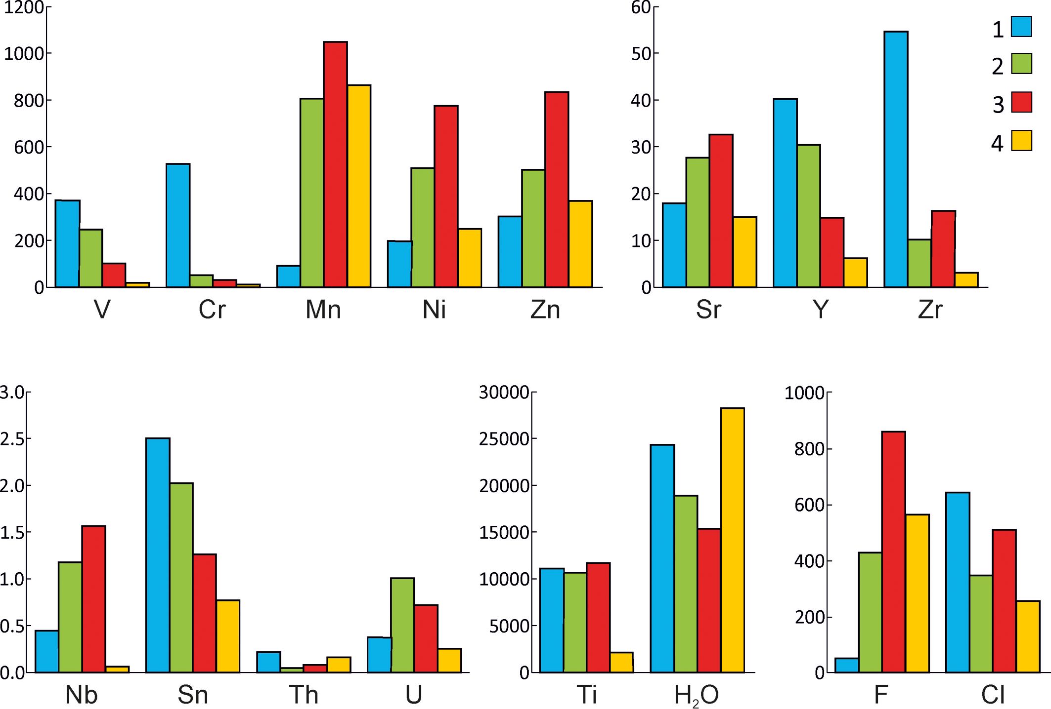 Рис. 3. Медианное содержание (ppm) редких элементов и летучих компонентов в везувиане различных минеральных ассоциаций (порода, копь): 1 — с гранатом и кальцитом (гранат-везувиановый мрамор, Зеленцовская); 2 — с гранатом и кальцитом (гранат-везувиан-кальцитовая жила на хлоритовом сланце, Николае-Максимилиановская); 3 — с клинохлором (родингит, Ахматовская); 4 — с кальцитом и гранатом (гранат-везувиановый скарн, Шишимская)