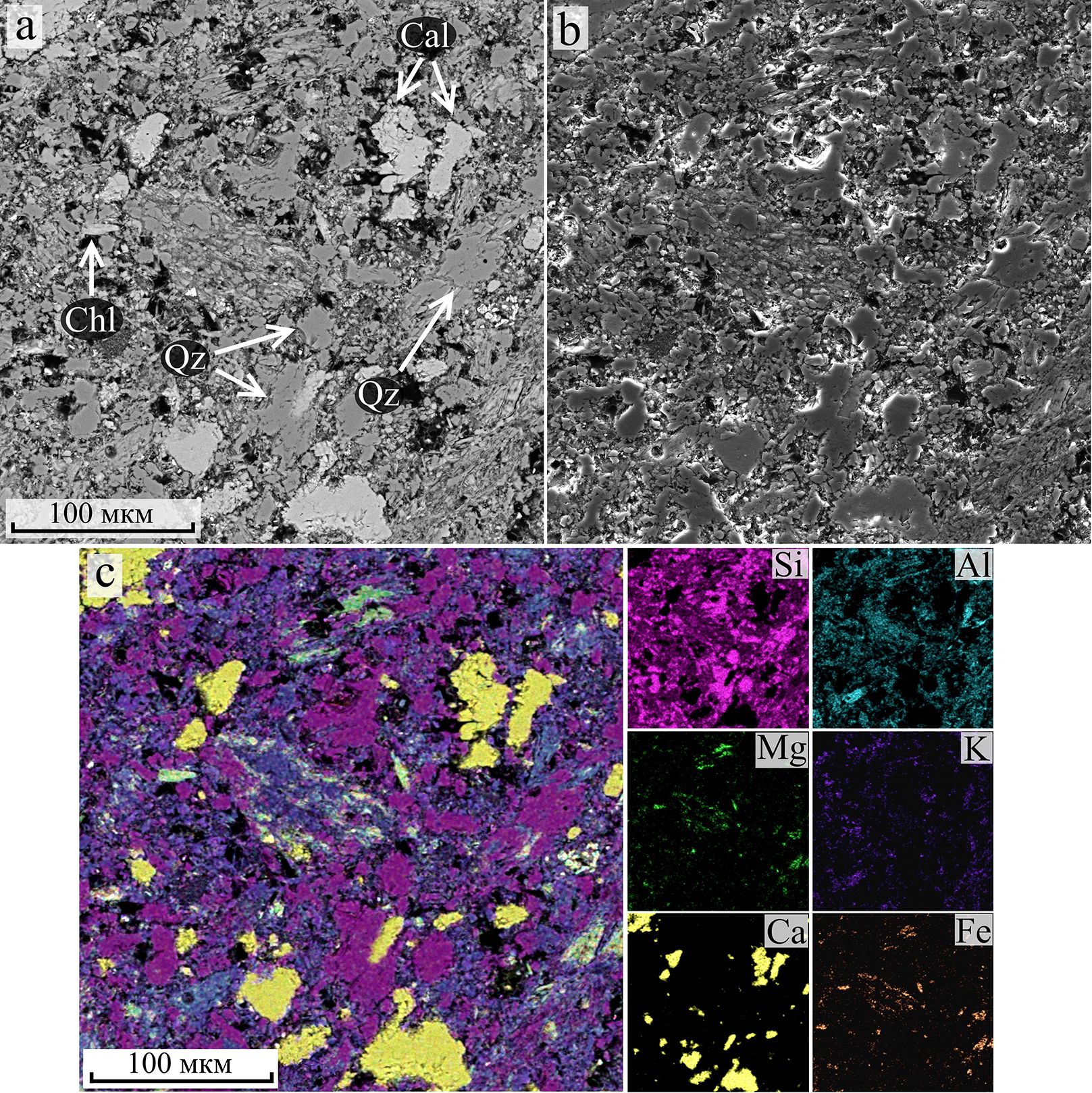 Рис. 1. Структурно-текстурные особенности (СЭМ-изображения: a — BSE, b — SE) и карты распределения химических элементов (c) в матриксе зювитов аэродинамической фации (р. Кара). Cal — кальцит, Chl — хлорит, Qz — кварц
