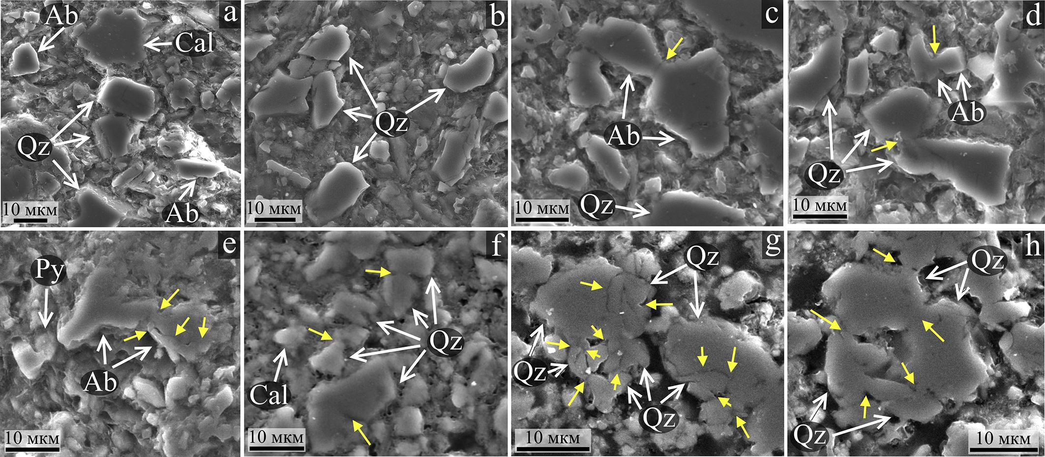 Fig. 2. Crystalloclasts in matrix of the ejecta facies of suevites (electron microscopic images, SE). Ab — albite, Cal — calcite, Py — pyrite, Qz — quartz. a–d — suevites of the Sayakha River area; e — suevites of the B. Vanuyta River area; f — suevites of the Kara River area; g, h — suevites of the Sopchayu River area. Yellow arrows point to sintering of the crystalloclasts