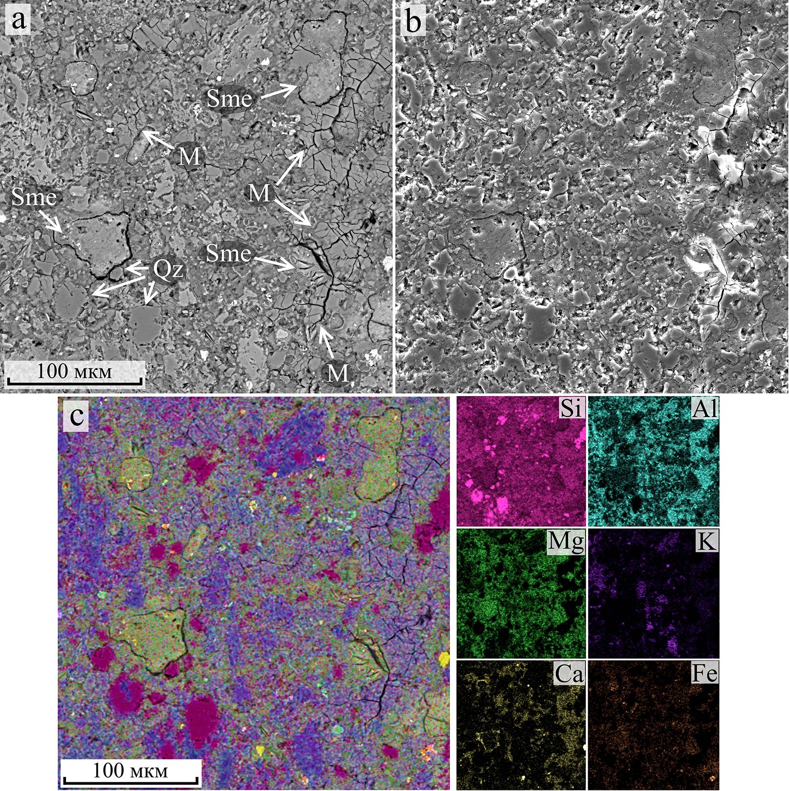 Рис. 3. Структурно-текстурные особенности (СЭМ-изображения: a — BSE, b — SE) и карты распределения химических элементов (c) в матриксе зювитов донной фации (р. Анарога). M — застывший импактный расплав, Sme — смектит, Qz — кварц