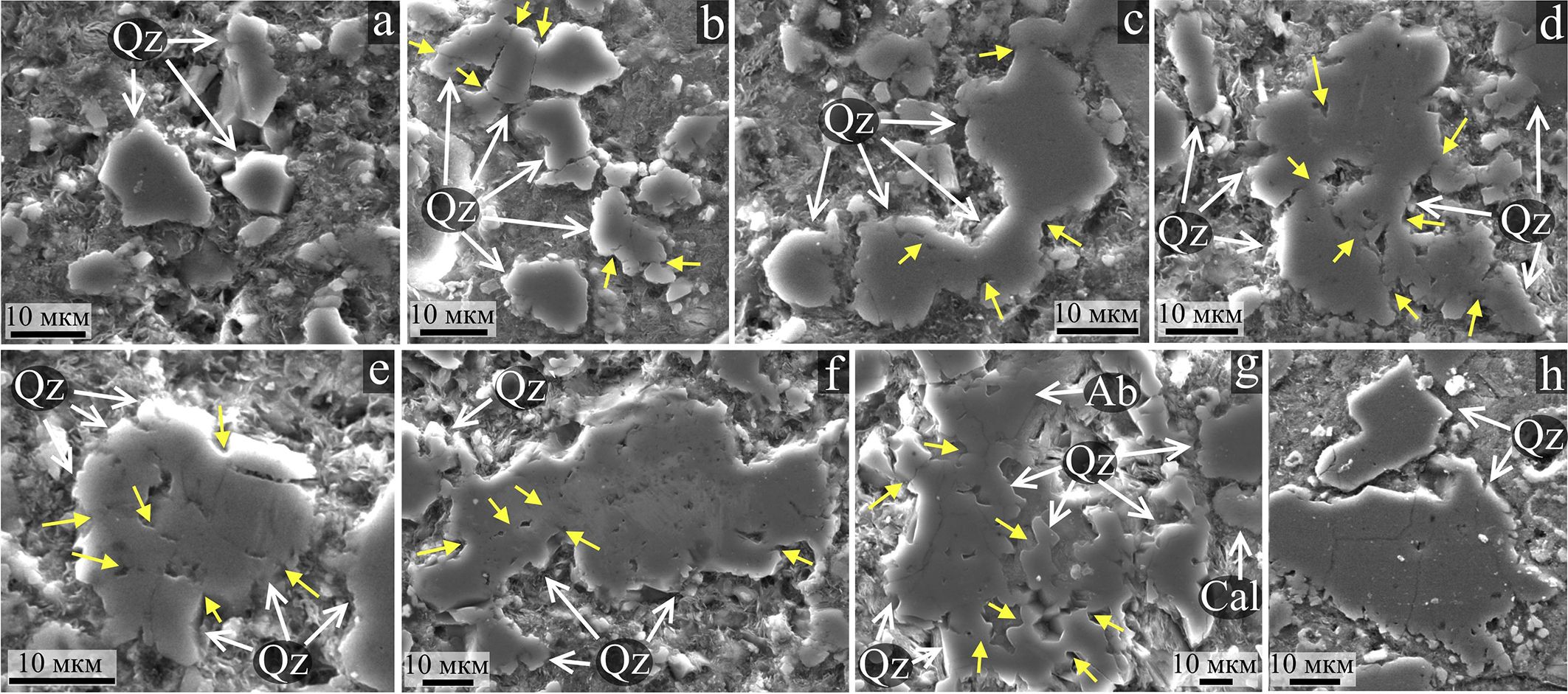 Рис. 4. Кристаллокласты кварца (Qz) и альбита (Ab) в матриксе зювитов донной фации (СЭМ-изображения, SE). a, с–g — зювиты района р. Кары; b, h — зювиты района р. Анароги. Желтыми стрелками показаны участки спекания кристаллокластов