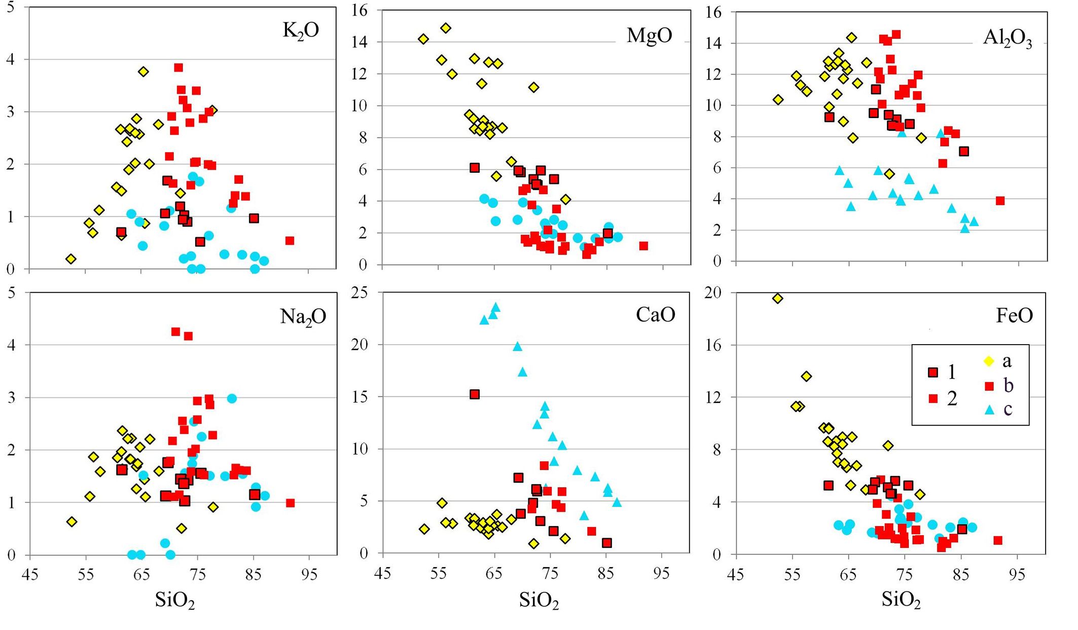 Рис. 5. Вариационные диаграммы петрогенных компонентов матрикса зювитов Карской астроблемы по данным площадного микрозондового анализа с нормированием на 100 (вес. %). Фации зювитов: 1 — донная, 2 — аэродинамическая. Районы распространения зювитов: а — р. Анарога, b — р. Кара, c — р. Сопчаю