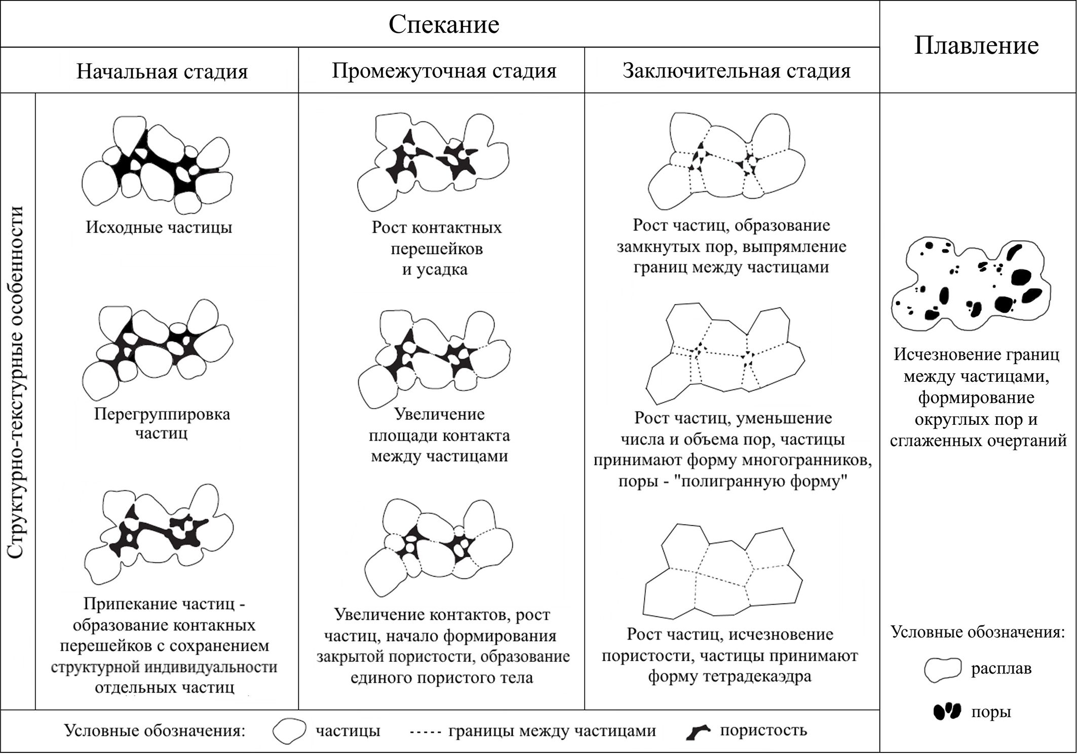 Рис. 6. Схема стадий спекания и плавления (по Андриянов, Лукин, 1979; Уляшев и др., 2023; Шелег и др., 2015; German, 2014; Kong et al., 2015; Richerson, Lee, 2018)