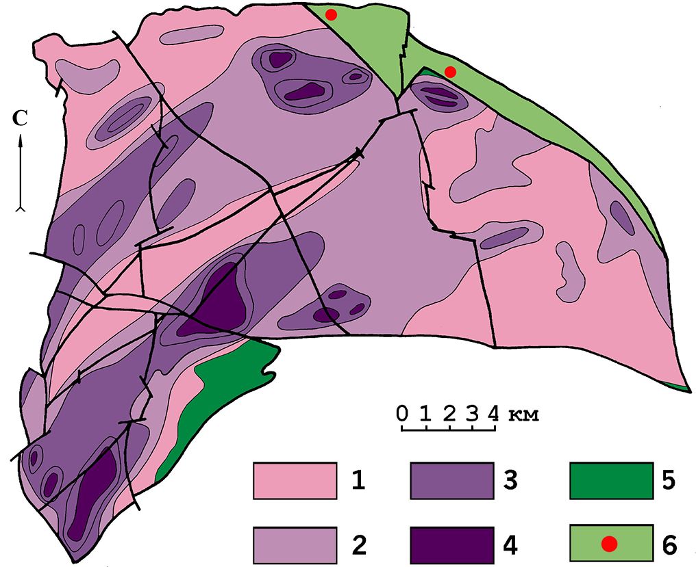 1 — 0–10 % дунитов (гарцбургит-лерцолитовый комплекс); 2 — 10–30 % дунитов (дунит-гарцбургитовый комплекс); 3 — 30–70 % дунитов (дунит-гарцбургитовый комплекс); 4 — > 70 % дунитов (дунитовый комплекс); 5 — полосчатый дунит-верлит-клинопироксенитовый комплекс; 6 — зона меланжа с проявлениями демантоида