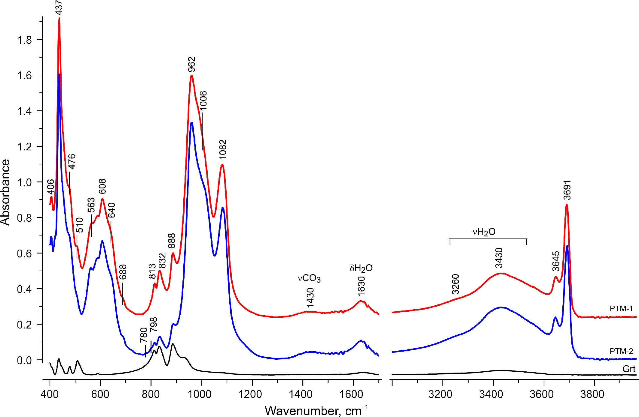 Полученные спектры приведены на рис. 3. Для определения положения пиков использовался сам спектр поглощения и его производные первого и второго порядков. Очевидно, что метод подготовки препаратов ИК в виде таблеток KBr привел к наличию в спектрах ИК-поглощения полос адсорбированной воды. В нашем случае это широкие полосы валентных и деформационных колебаний OH-групп воды в области 3400–3200 и 1630 см-1, соответственно. Малоинтенсивная полоса в области 1430 см-1 свидетельствует о наличии в пробе следов карбоната. Относительно узкие линии 888, 832, 813 и плечо 507–510 см-1 относятся к остаткам андрадита во вмещающей породе. В спектре пробы РТМ-2 присутствует дублет низкой интенсивности 780 и 798 см-1, относящийся к кварцу, в спектре РТМ-1 он не заметен.
