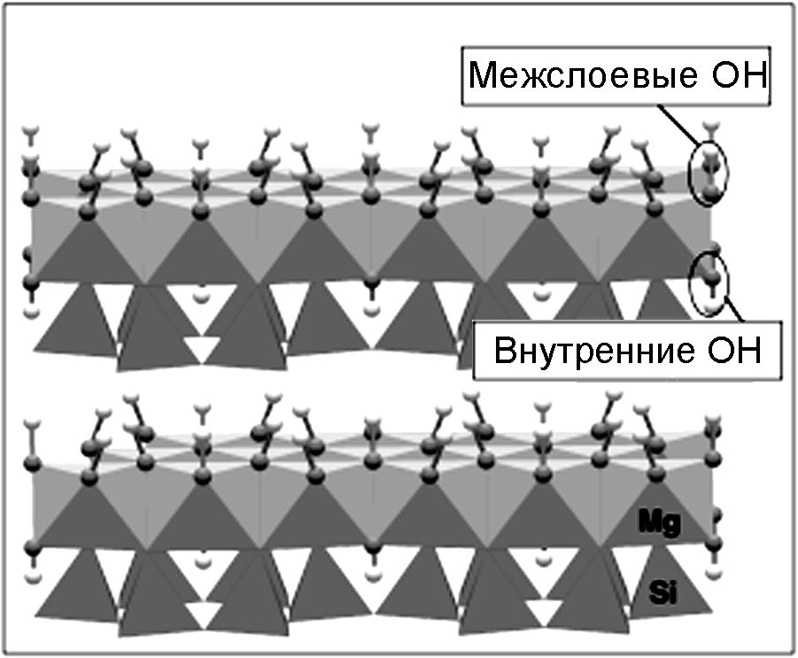 В соответствии с классификацией мод колебаний решетки минералов группы серпентина по (Balan et al., 2002), интенсивный пик с максимумом около 3691 см-1 (рис. 3, табл. 2) относится к валентным синфазным колебаниям межслоевых ОН-групп октаэдрического слоя, а малоинтенсивный пик 3645 см-1 — к валентным колебаниям внутренней OH-группы октаэдрической сетки (рис. 4).