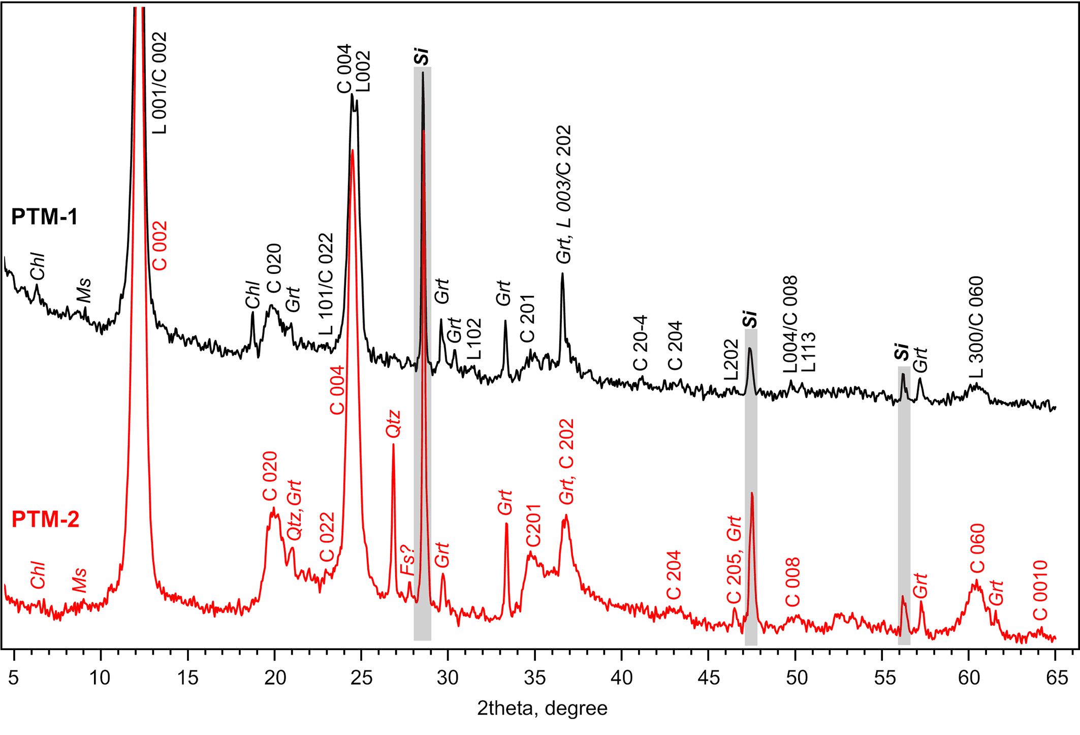 Fig. 5. X-ray diffraction patterns of host rock samples PTM-1 and PTM-2. C hkl and L hkl are reflections of chrysotile and lizardite; Grt, Chl, Ms and Qtz are reflections of garnet, chlorite, illite and quartz; Si — reflections of reference crystalline silicon