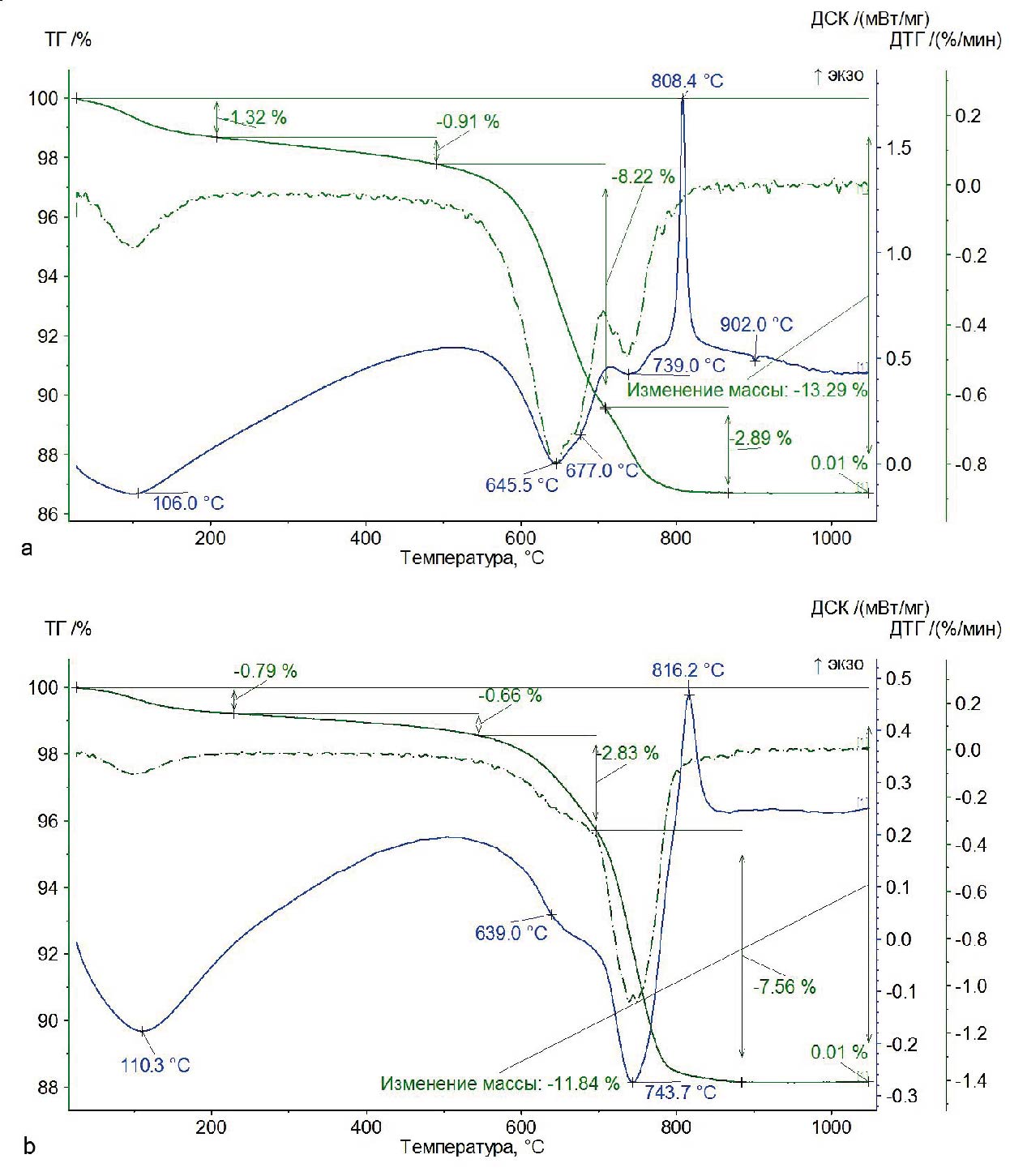 Fig. 7. Thermograms of serpentinites — host rocks of andradite-demantoid occurrences: a — sample PTM-1, b — sample PTM-2. Solid green line — mass loss (ТГ); dash-dotted green line — differential mass loss (ДТГ); blue line — differential scanning calorimetry (ДСК)