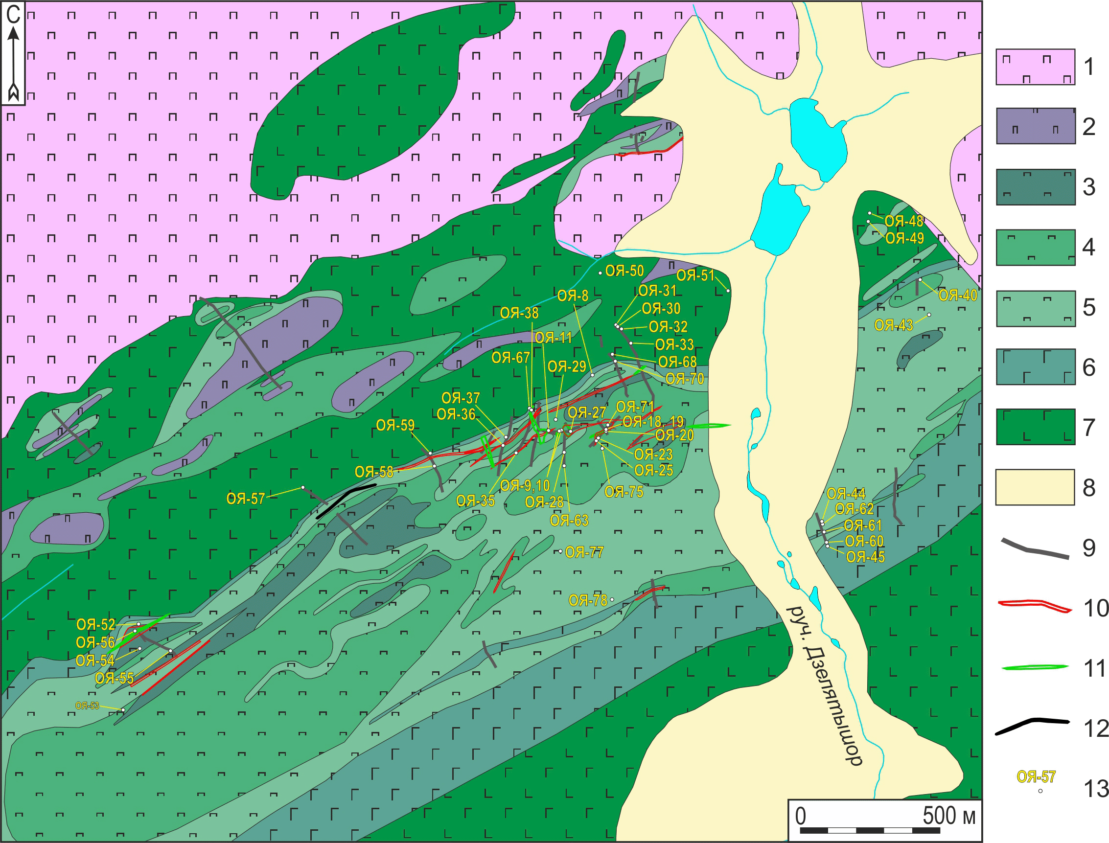 1 — дуниты и гарцбургиты нерасчлененные райизско-войкарского комплекса (PZ1?); 2—6 — породы кэршорского «полосчатого» комплекса (O3?): 2 — верлиты и оливиниты нерасчлененные, 3 — клинопироксениты высокооливиновые (оливина 20—40 об.%), 4 — клинопироксениты оливиновые, 5 — клинопироксениты, 6 — габброиды; 7 — аподолеритовые и апогаббровые бластомилониты с полосчатой текстурой, предположительно относящиеся к лагортаюскому комплексу параллельных даек (O3); 8 — аллювиальные и флювиогляциальные отложения (QIV); 9 — канавы; 10—12 — выходы рудных тел: 10 — Au-Pt-Pd, 11 — Cu, 12 — железорудные; 13 — точки наших геологических наблюдений и отбора образцов